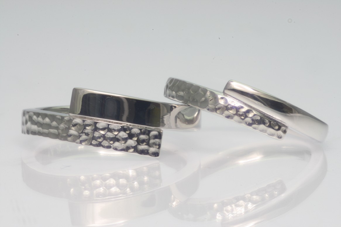 平打ちベースの指輪をウェーブをかけながらセンターで交わるようにデザイン。センターは幅太になり存在感がありますが、手のひら側は3mm幅前後と、通常の指輪と変わらない幅なので圧迫感もなく着けやすいデザインとなっています。槌目加工を半周施し、味わい深い指輪となっています。