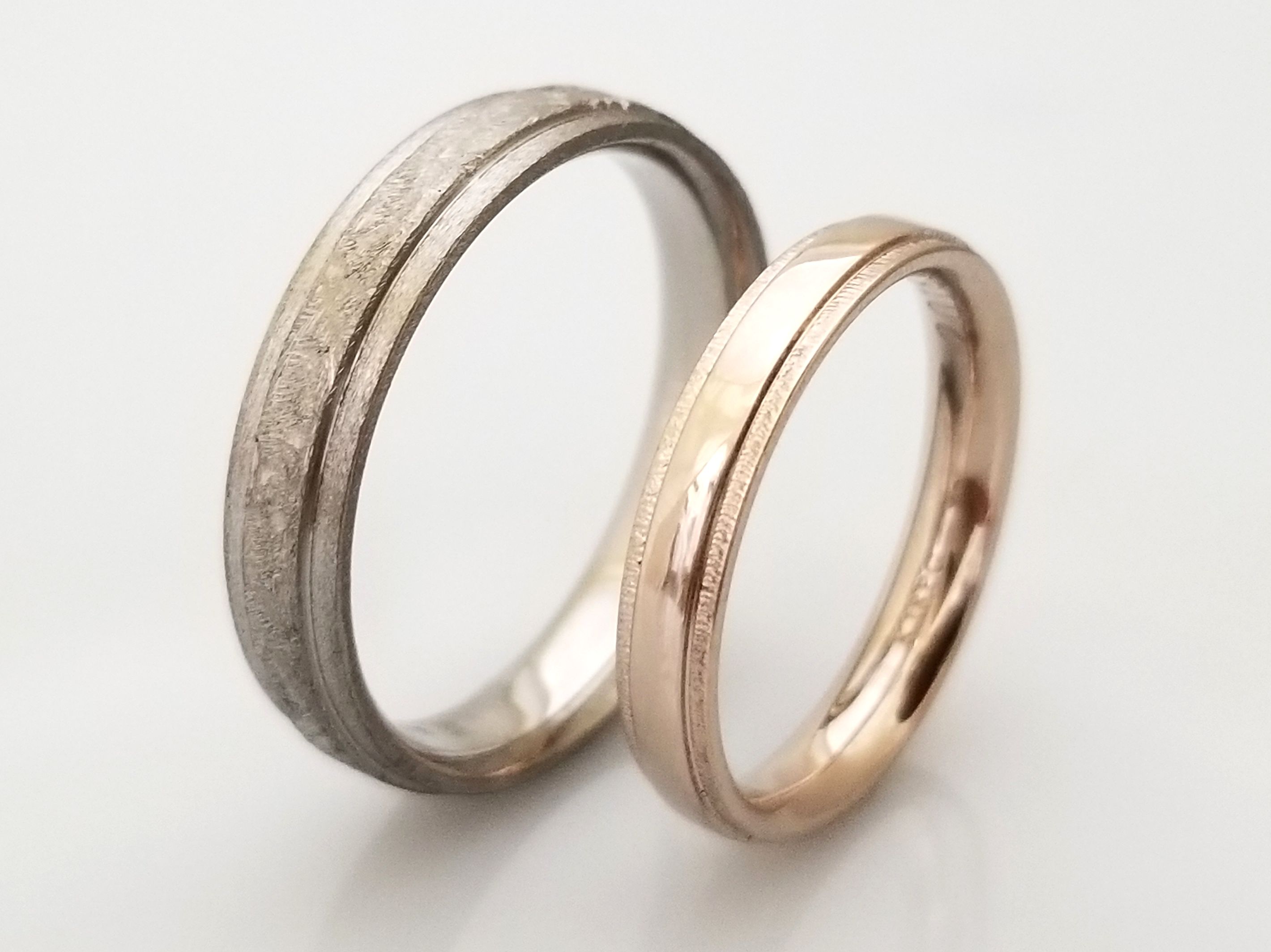 男性は上下の縁を少し太くして荒いつや消しを入れ、中央部分には岩のような質感になる加工を施しました。女性は中央部分は鏡面加工のままに、上下の縁は縦線のように見えるテクスチャーを入れました。さり気なく反射する上品なデザインです。