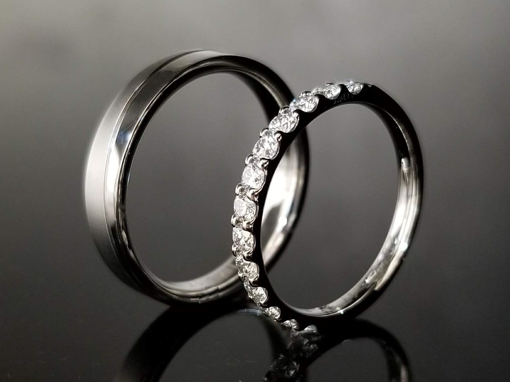 プラチナを鍛え上げストレートのフォルムに整えます。男性は滑らかに1本のラインを一周に加工。つや消しと鏡面のコントラストが美しいです。女性はダイヤモンドをハーフエタニティにセッティング。1石1石のダイヤモンドの品質をこだわりました。