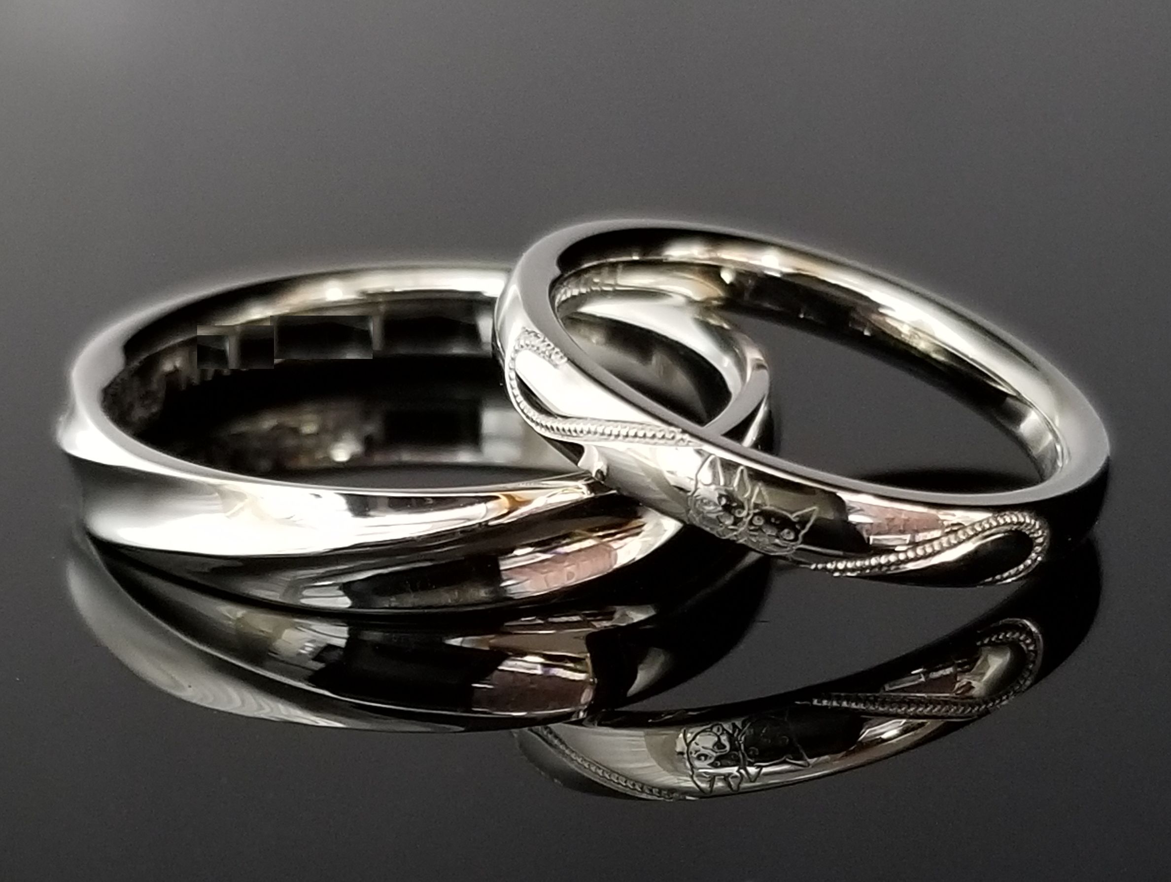 男性は右上がりに大きくえぐり加工を施しダイナミックな印象の指輪に。女性は飼っている愛犬の似顔絵をセンターに刻印し、サイドはハートをイメージして可愛くミル加工を施しました。男性の内側にも愛犬が刻印されており、お二人だけの素敵なご結婚指輪に仕上がりました。