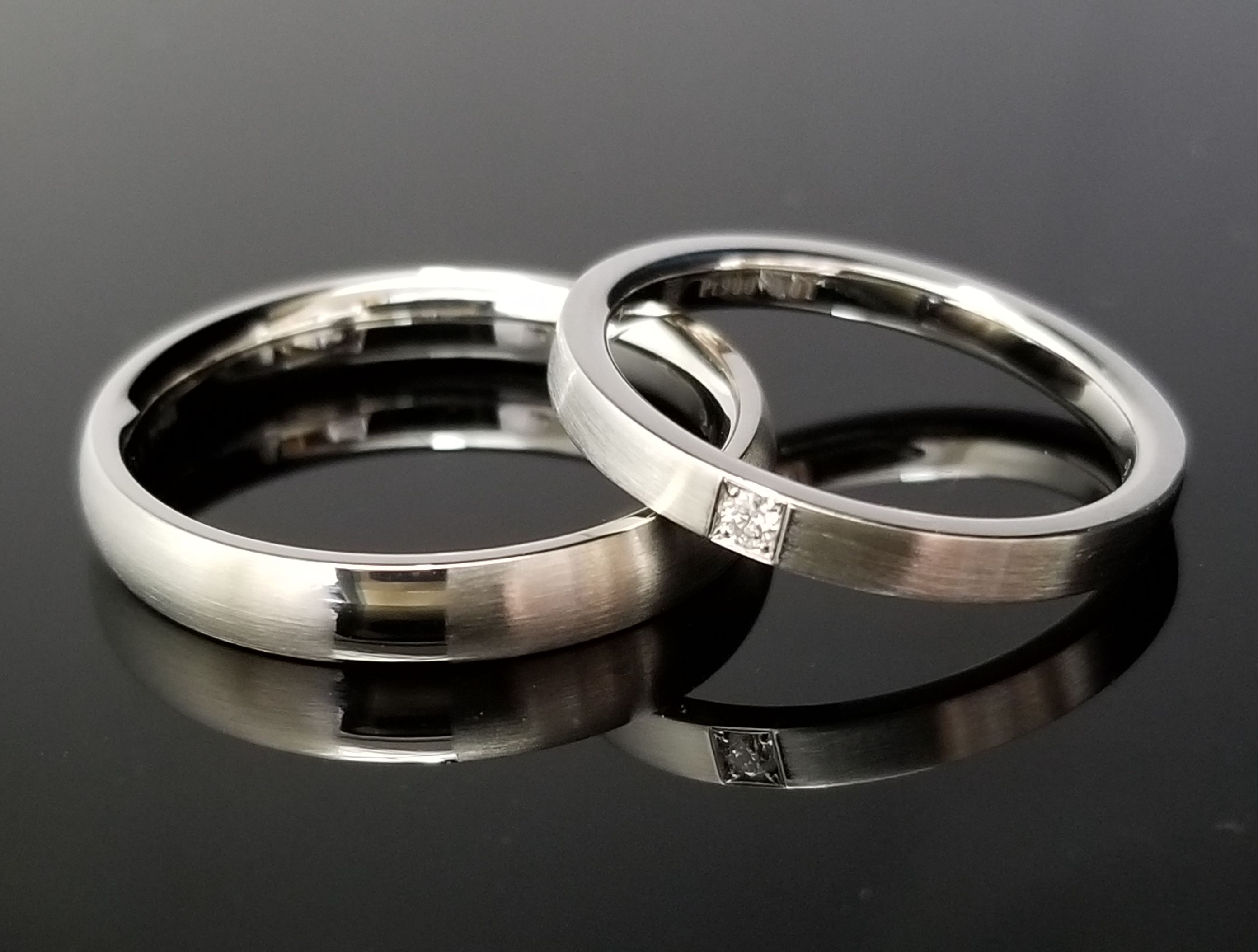 男性は四角く鏡面部分を残し、ヘアライン加工を。女性は表に丸いダイヤモンドを四角く見えるようにセッティングし、手のひら側は男性とお揃いの四角く残した鏡面部分を作りました。
