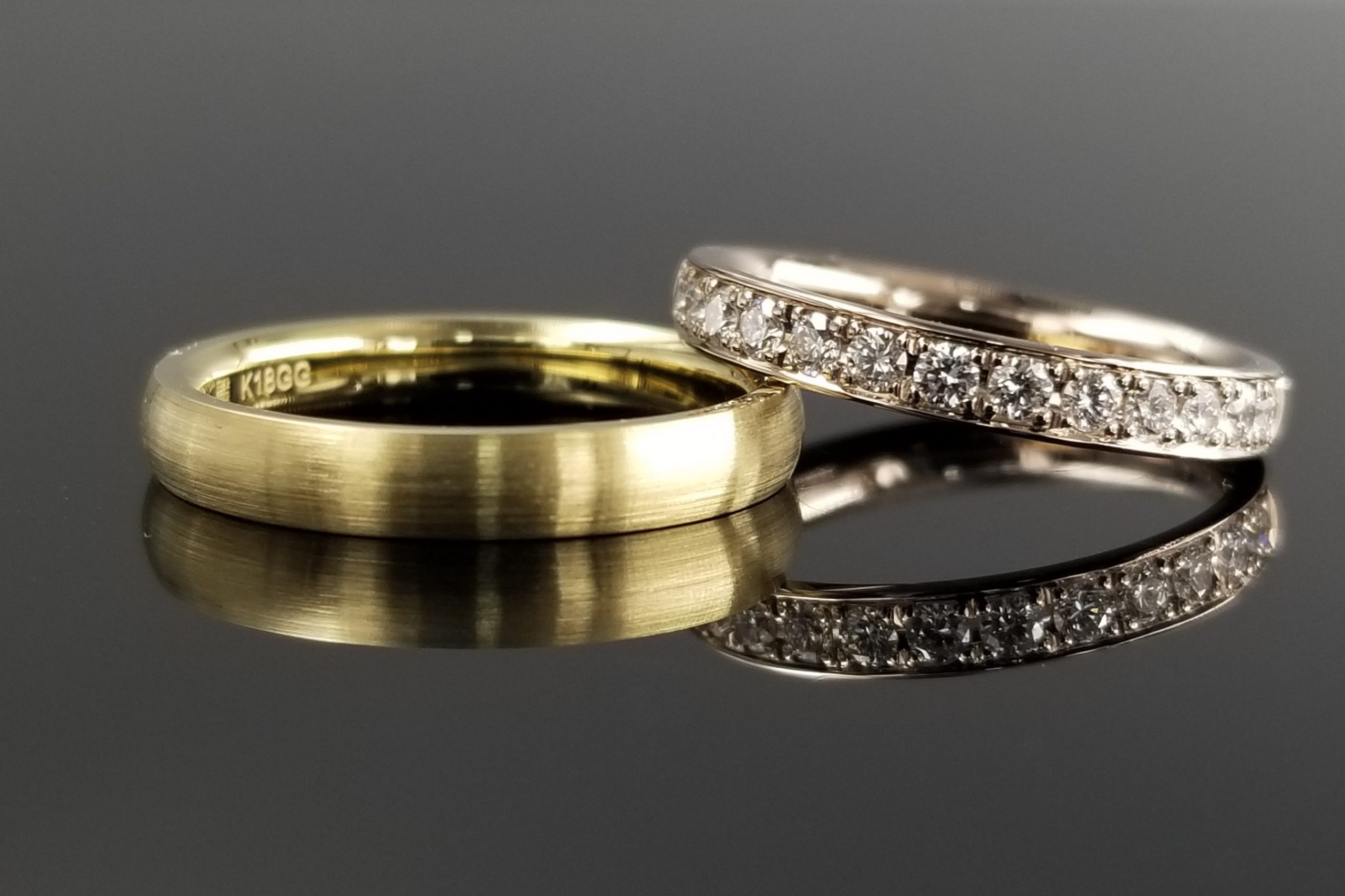 男性は、すっきりとした爽やかな印象のグリーンゴールドの地金を使用し、ヘアライン加工でお洒落に艶を抑えたデザインに。