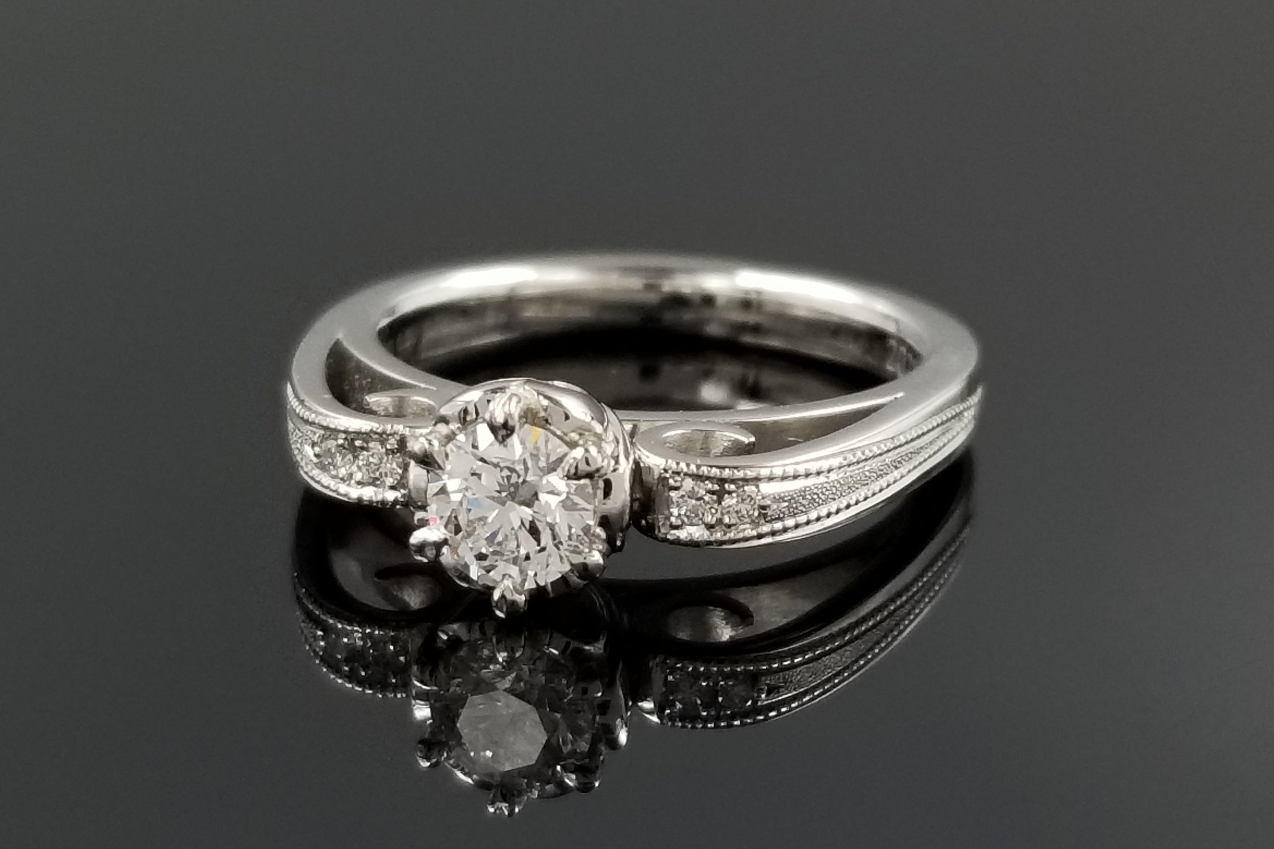 センターダイヤモンドをお留めする爪の一つと、シャトンに開けた窓がハートに。