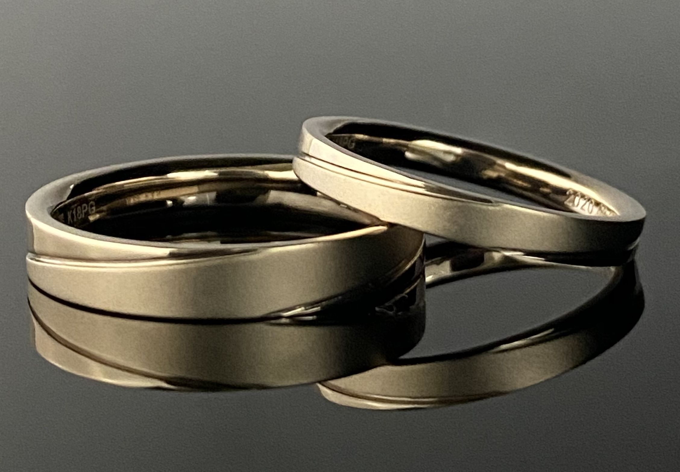 弊社オリジナルのコーラルゴールドで柔らかな印象ながらも、形状を平打ちにすることでスタイリッシュな仕上がりに。またライン加工を施すことで、センターのマット加工がより際立ちます。弊社鍛造フルオーダーならでは素材と形状、デザインを素敵に組み合わせることで、丈夫で傷のつきづらいお二人のだけのこだわりのご結婚指輪が完成いたします。