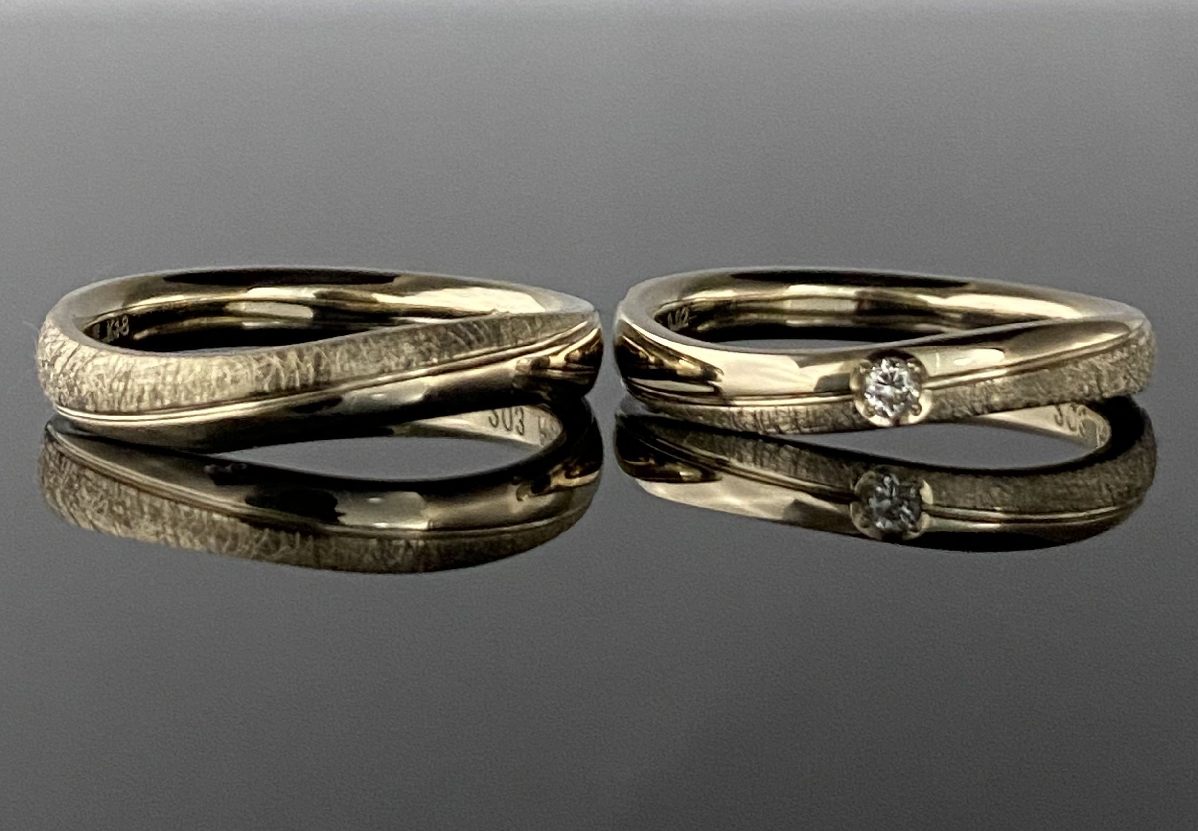 柔らかなシャンパンゴールドとシックな和紙加工の相性がとても良く、お二人で身に着けて頂くご結婚指輪にぴったりのデザインとなりました。またライン加工が入ることで更にウェーブ感が強調されます。素材や加工、着け心地すべてにこだわった鍛造製法フルオーダーマリッジリングが完成いたします。