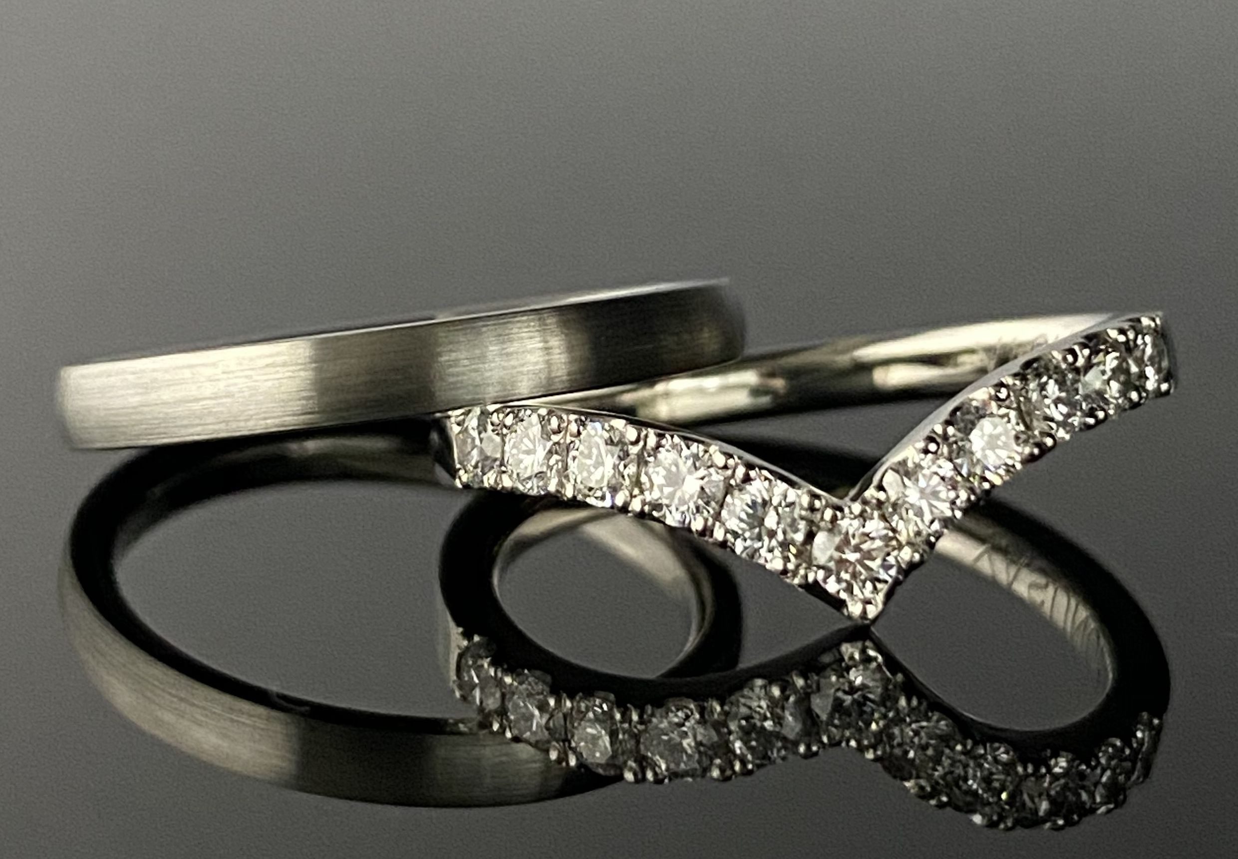 職人が全て手掛けます職人鍛造でお造りした丈夫で美しいV字のハーフエタニティでございます。V字のカーブ具合またハーフエタニティといったご希望を叶える為、デザイン確認を重ね完成した唯一無二のご結婚指輪です。ご主人様はシンプルなストレート形状ながらも光の入り方が美しいヘアライン加工を施し、お二人の指輪が並んだ際にもまとまりが出る様お造りいたしました。