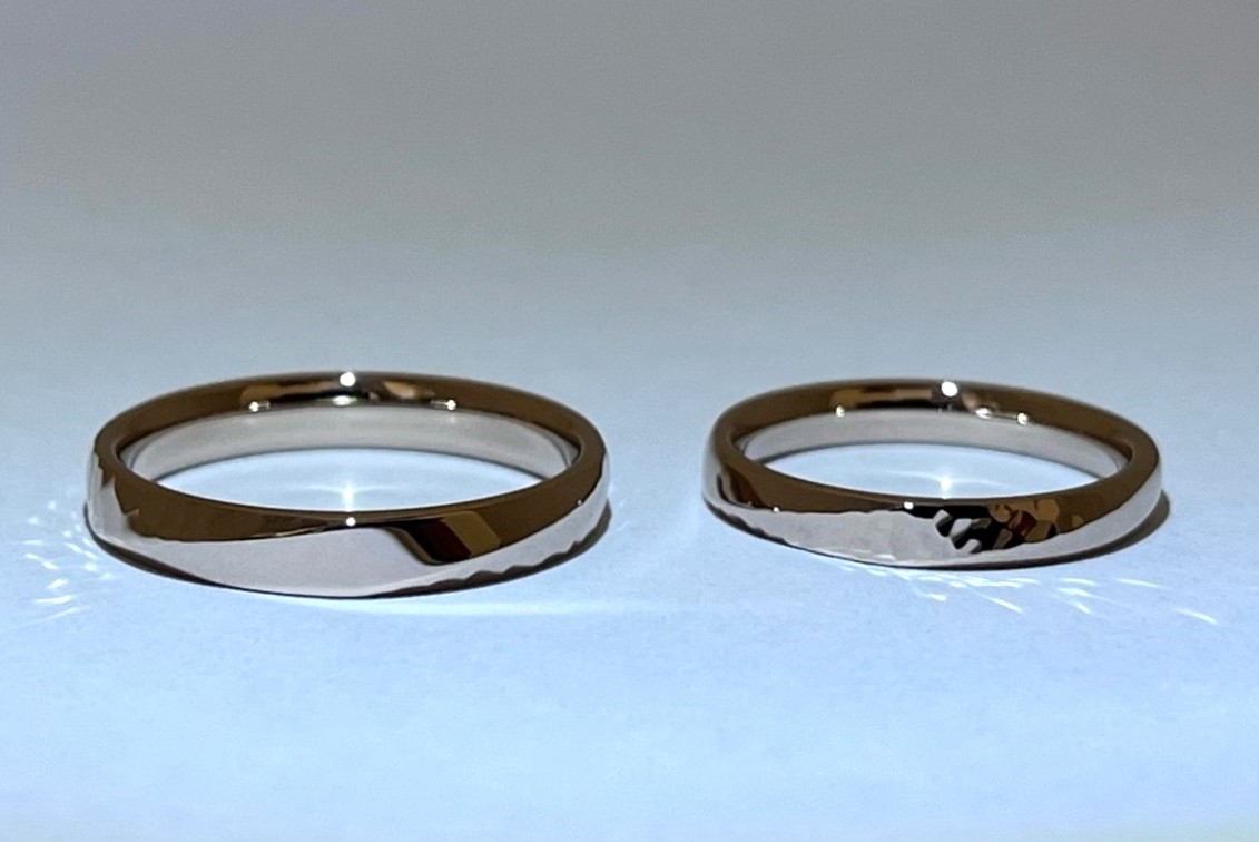 また、春の霞がかかった景色を、やわらかく反射する槌目加工の凹凸で表現しています。 そして、お互いが持っていない部分を補い合うように、お二人で一つのデザインとなっております。