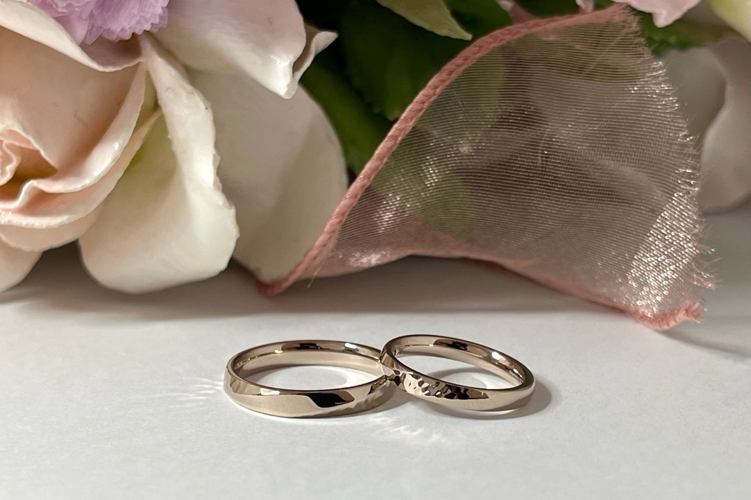 お気に召してくださいました『はるがすみ』のデザインで、お色味はお二人様とも弊社オリジナルカラーの桜色をイメージしたコーラルゴールドでお造りしました!