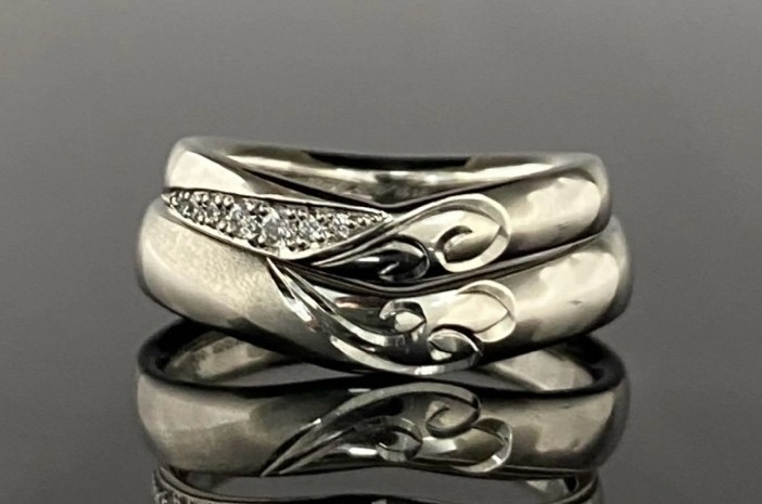 その指輪がこちらで、それぞれの指輪の中央に羽のモチーフを彫り、さらに2本の指輪を重ねるとハートが浮かび上がるデザインです。