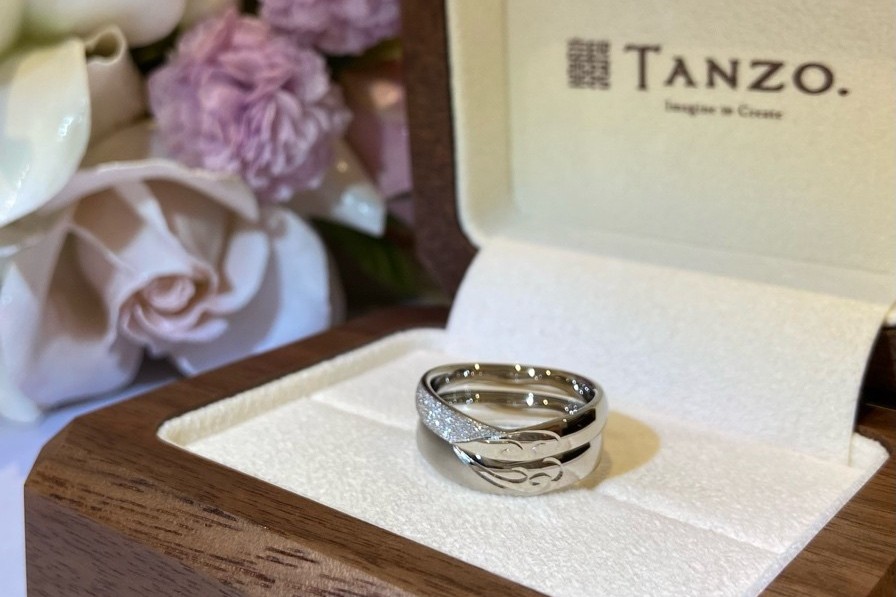 ご来店時にお話をお伺いさせていただくと、ご主人様が数年前にご結婚指輪を失くされてしまったそうで、ここ最近は奥様のみ指輪を着けて過ごされており、また新たにお二人様揃ってご結婚指輪を造りたいと思っていたところ、TANZOのオーダーメイドに惹かれて広島からご来店下さいました。