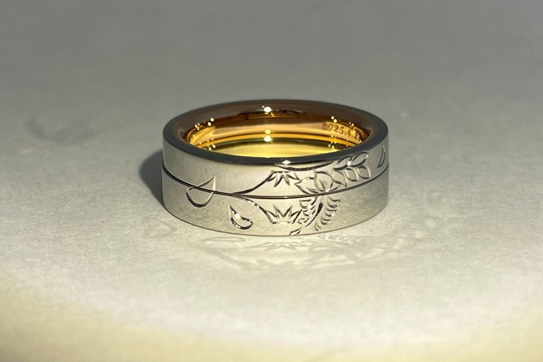 離れていても指輪を見るだけでお互いを思い出せるような、二本の指輪を重ねることで現れる「水鏡の富士山」と「藤の花」の手彫りが美しい、唯一無二のご結婚指輪ですね…!