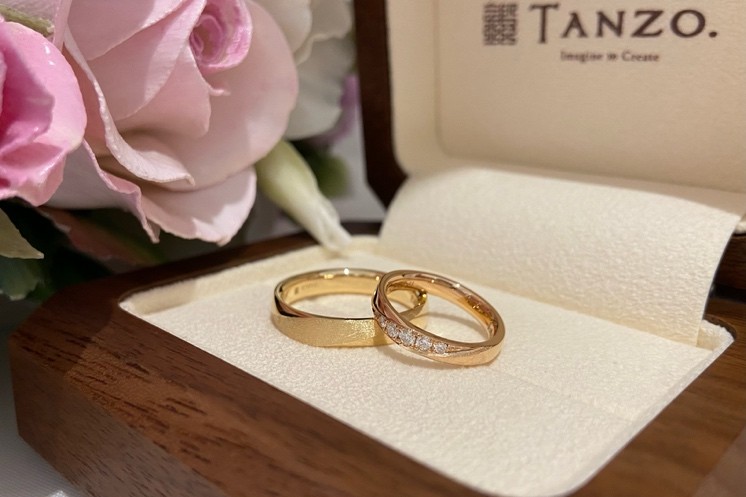 一生もののご結婚指輪を探す中で、品質や着け心地はもちろん、自分たちの大切にしたい想いをしっかりと形にできるTANZOのオーダーメイドを知り、ワクワクした様子でご来店くださいました。