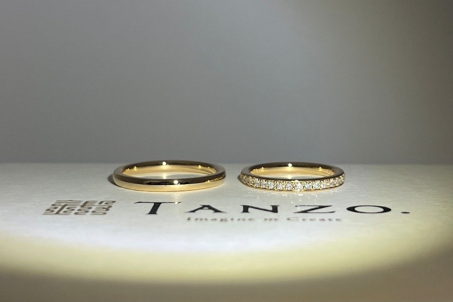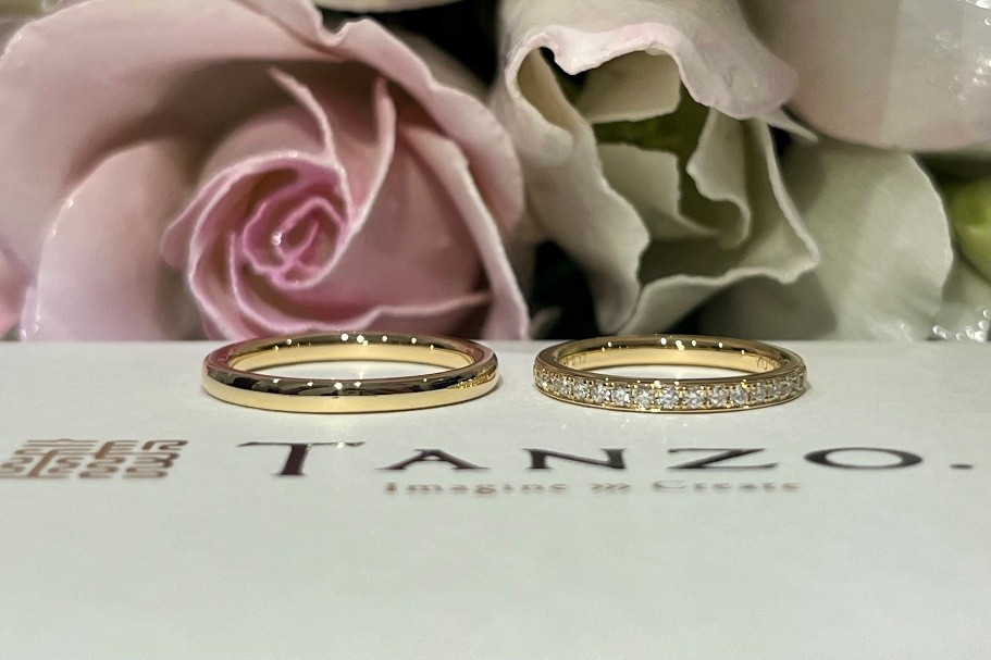 華奢な印象のエタニティリングの幅に合わせて、ご主人様のご結婚指輪もお造りさせて頂きました!並べた時のダイヤのキラキラな印象と地金のツヤがとっても素敵で、肌の色に馴染むお揃いのイエローゴールドのお色味がよりお二人様だけの特別感をぐっと引き出しています…!
