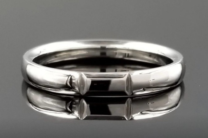 お二人様ともお揃いの形状に、それぞれお好みの正面が決まるデザインで、奥様はダイヤモンドと、ご主人様は『思ひき我は』に施されているカッティングのデザインをお入れいたしました。