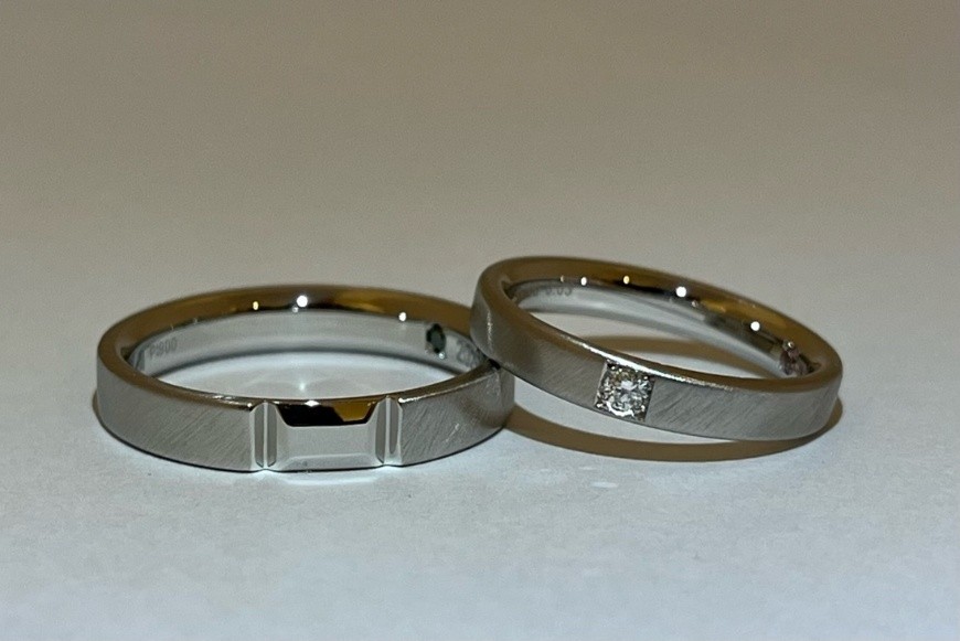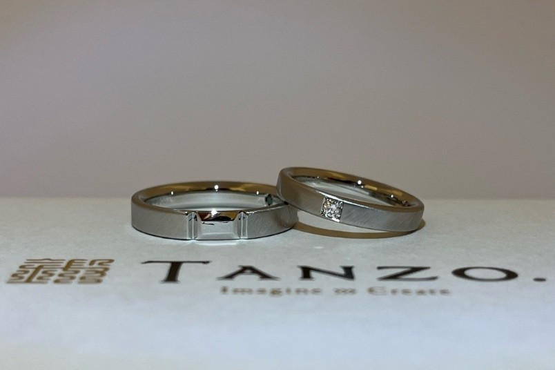 たくさん悩みながら、たくさんお話しさせていただき、お二人様らしさを求めて作り上げた素敵なご結婚指輪。ご納品時、お互いがご結婚指輪を着けた左手の薬指を見ながら、微笑んで喜んでくださったお姿がとっても素敵でございました。