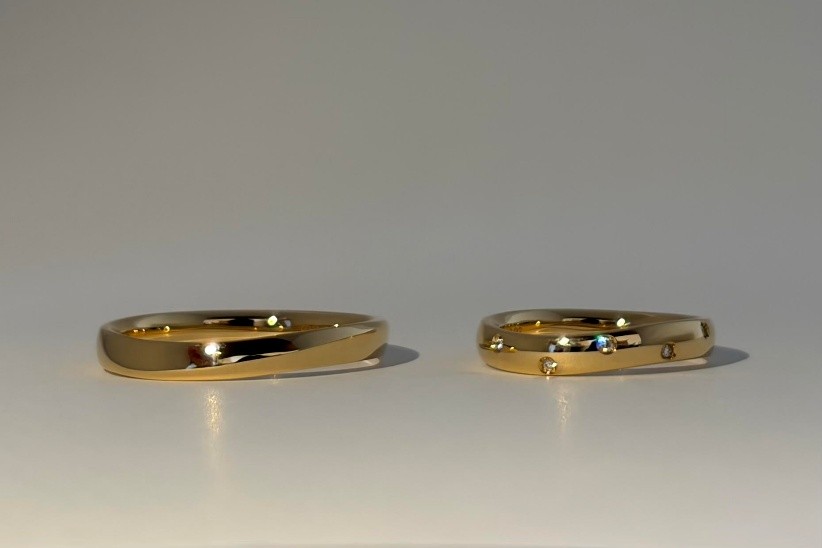お二人とも、幅・色味・形状に関しては息ぴったりで、3mm幅のイエローゴールド、S字ウェーブの形状をお選びいただきました。