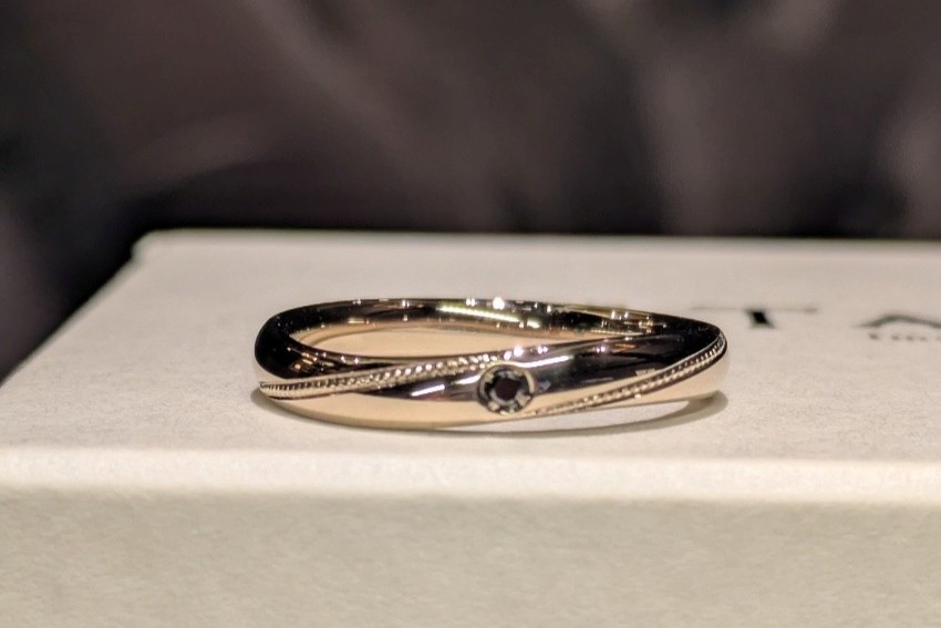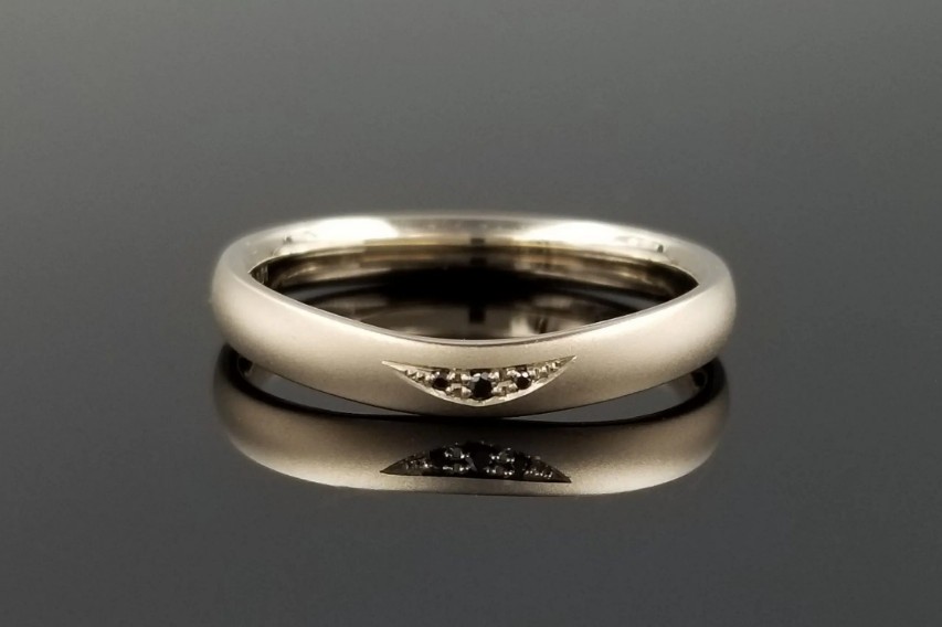 お持ちした【月立ちて】は全周に施されたマット加工の優しい風合いの中にブラックダイヤモンドを3ピースお留めしたデザインでございます。ブラックダイヤモンドを使用することで個性的なデザインになるかと思いきや、大人のカッコよさを引き出すことの出来る仕上がりとなります。