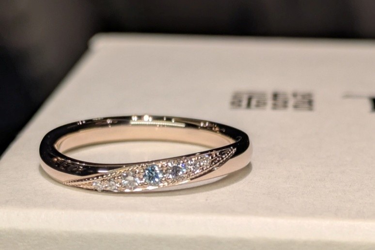 ご主人様にご覧いただいたところ、「自分の指輪にダイヤなんて考えてもなかったけど、一目見ただけなのにずっと気になる」とのこと。