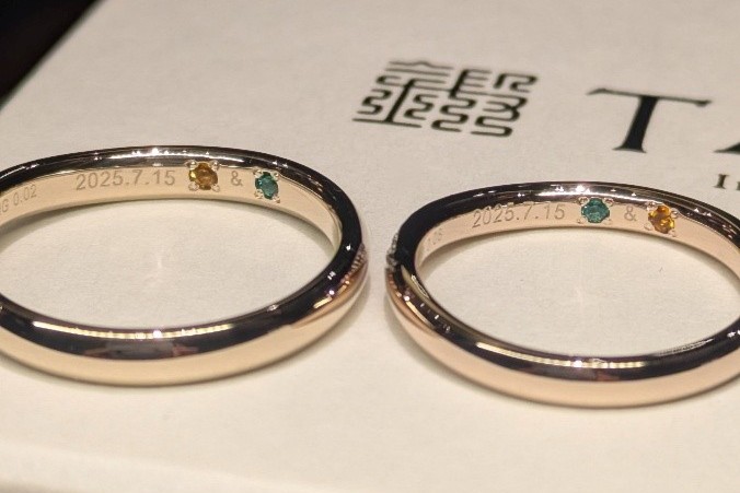 お二人とも中央にカラーダイヤモンドをあしらい、斜めにミルグレイン、素材は淡いゴールドのコーラルゴールドとシャンパンゴールド、とお揃い感満載でありながらも、それぞれのお好みも追求したデザインになりました。