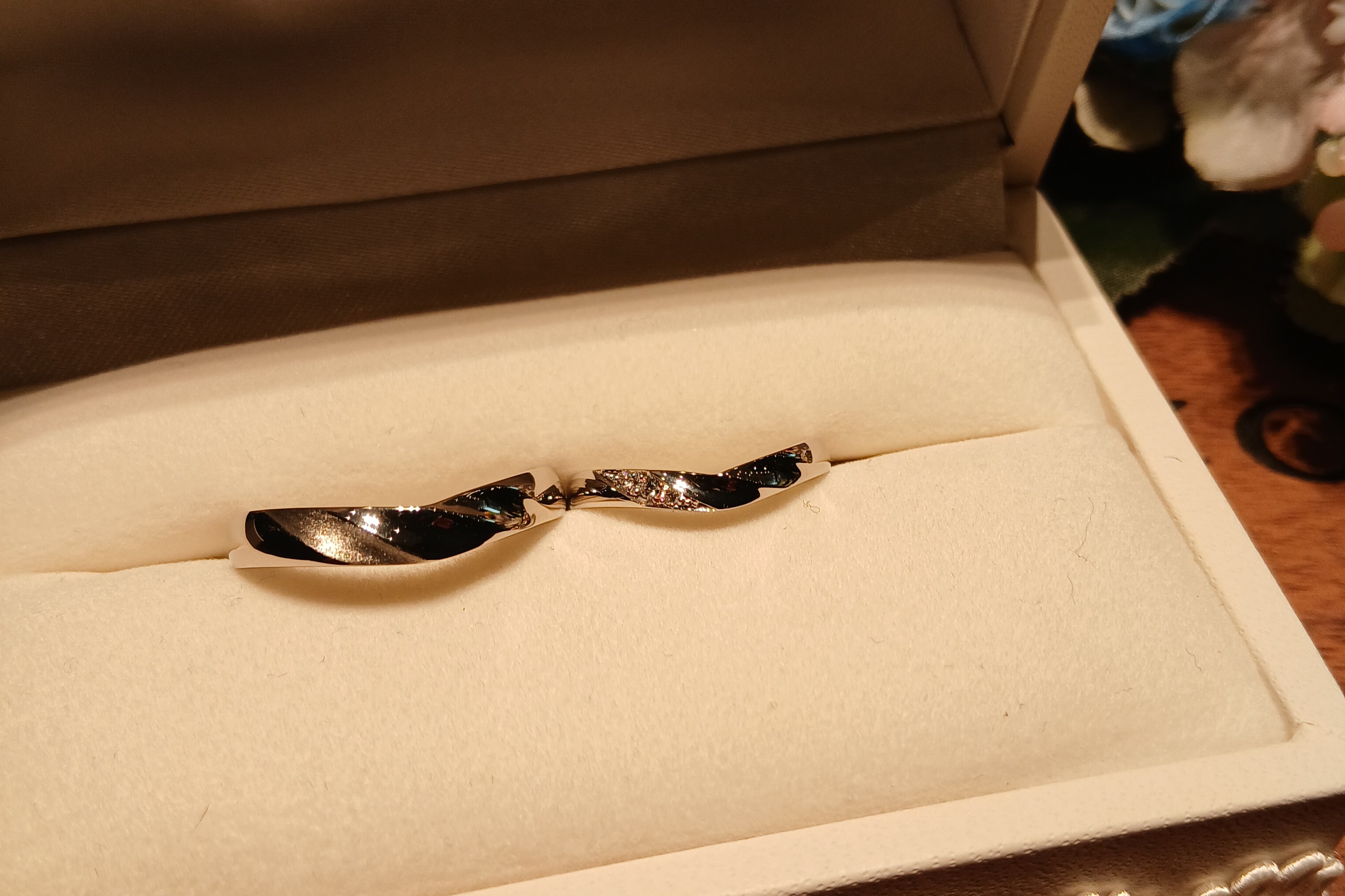 ご婚約指輪のV字形状に合わせて、ご結婚指輪もV字形状に。TANZOではV字の形状もお選び頂けますが、その中で着け比べながら、よりご婚約指輪と合う形はどちらだろう?と考えられるお二人の姿が印象的でございました。