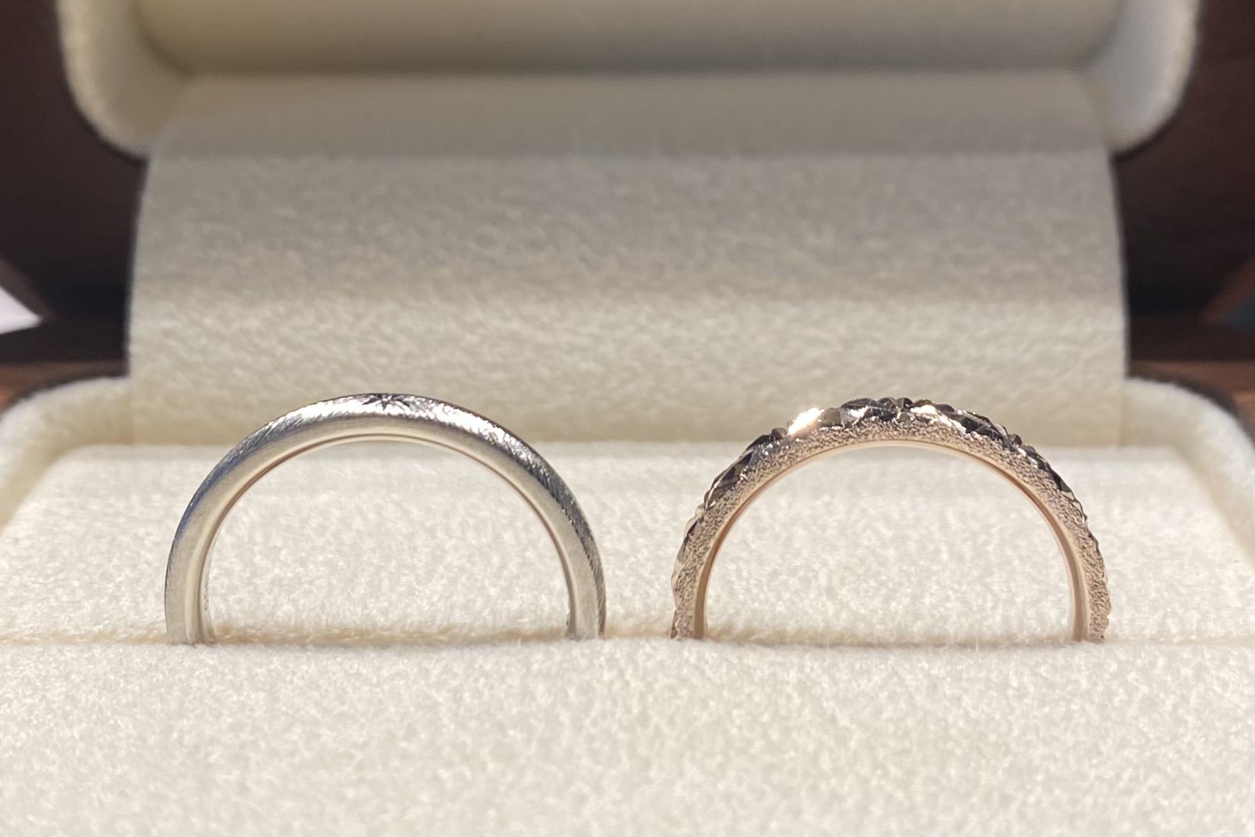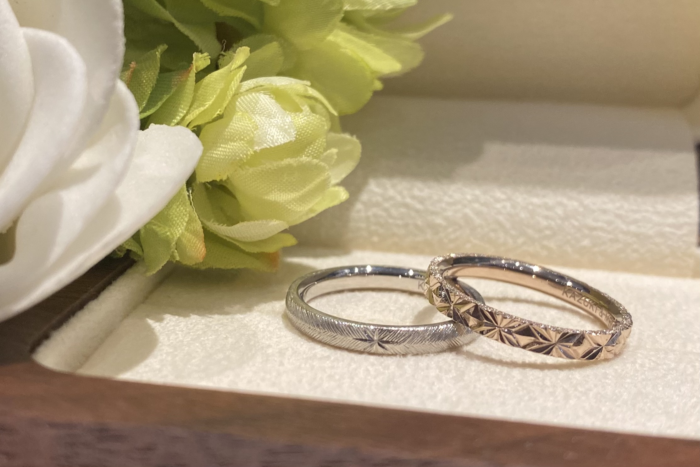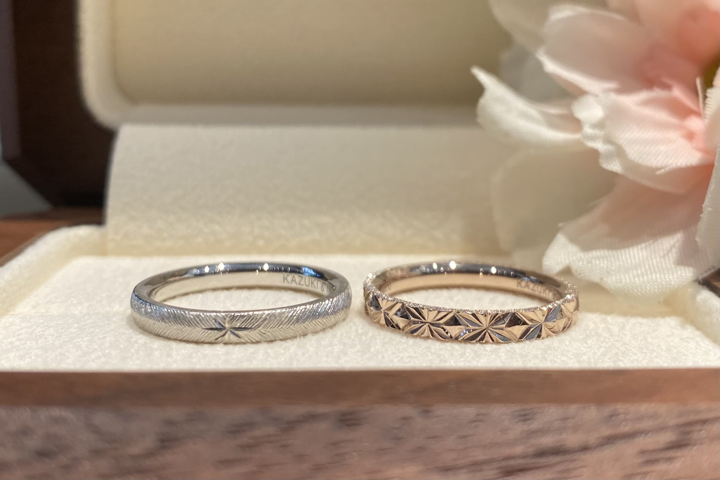 偶然、目に入ったケガキ彫りのリングとカット彫りのリングがお二人それぞれのお好みにぴったりだったそう!