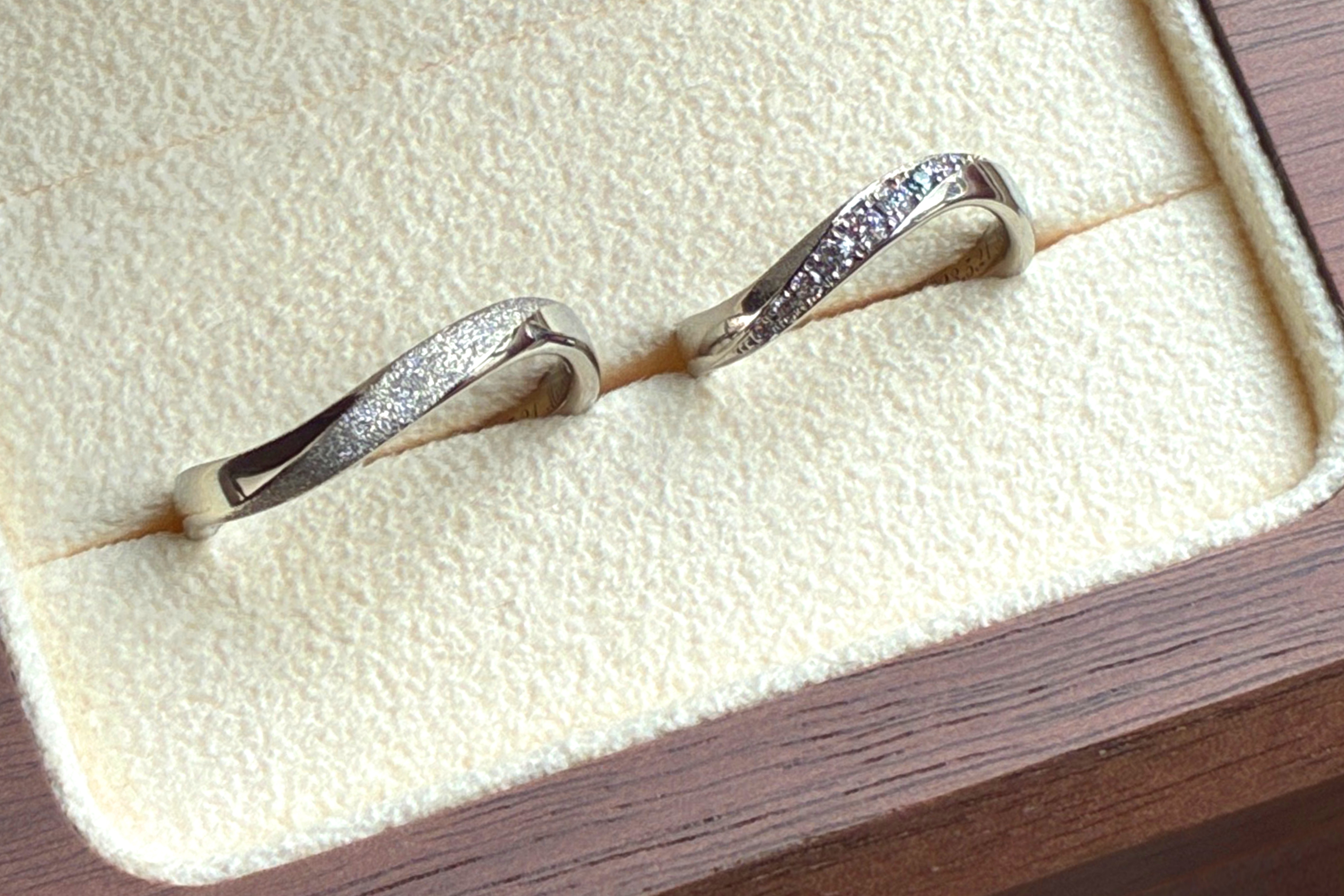 お二人お揃いのスターダスト加工は華やかに煌めき、奥様の指輪にはこだわりのスカイブルーダイヤが!すっきりとしたウェーブ感も印象的な、お二人のこだわりがぎゅっとつめこまれた素敵なご結婚指輪でございます。私もお二人と約1年のお付き合いとなっておりましたので、仕上がりました際は感無量でございました!