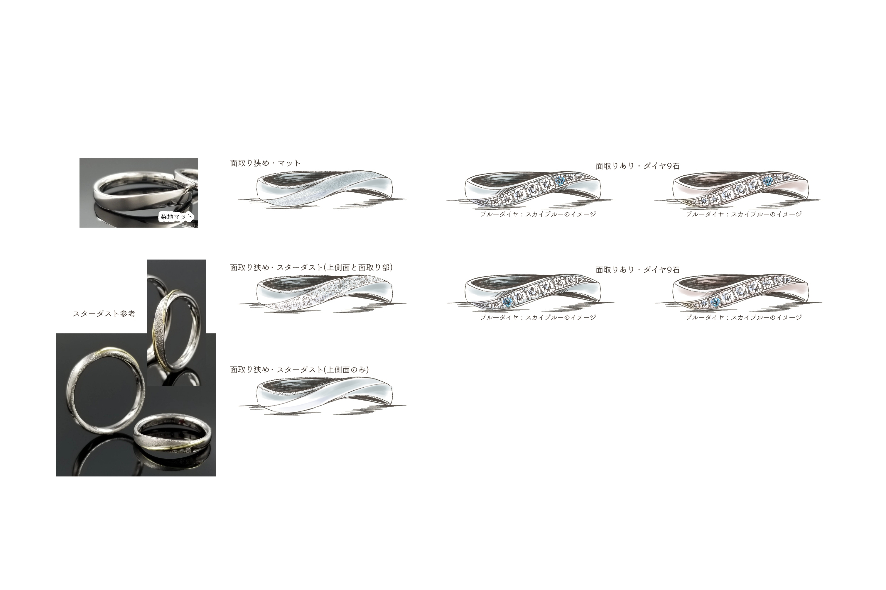 デザイン画で見比べて頂き、確定していきます。加工の細かいところまでご質問があり、本当にご結婚指輪のお造りを大切に思われているのだなと、こちらからのご提案にも熱が入ります。