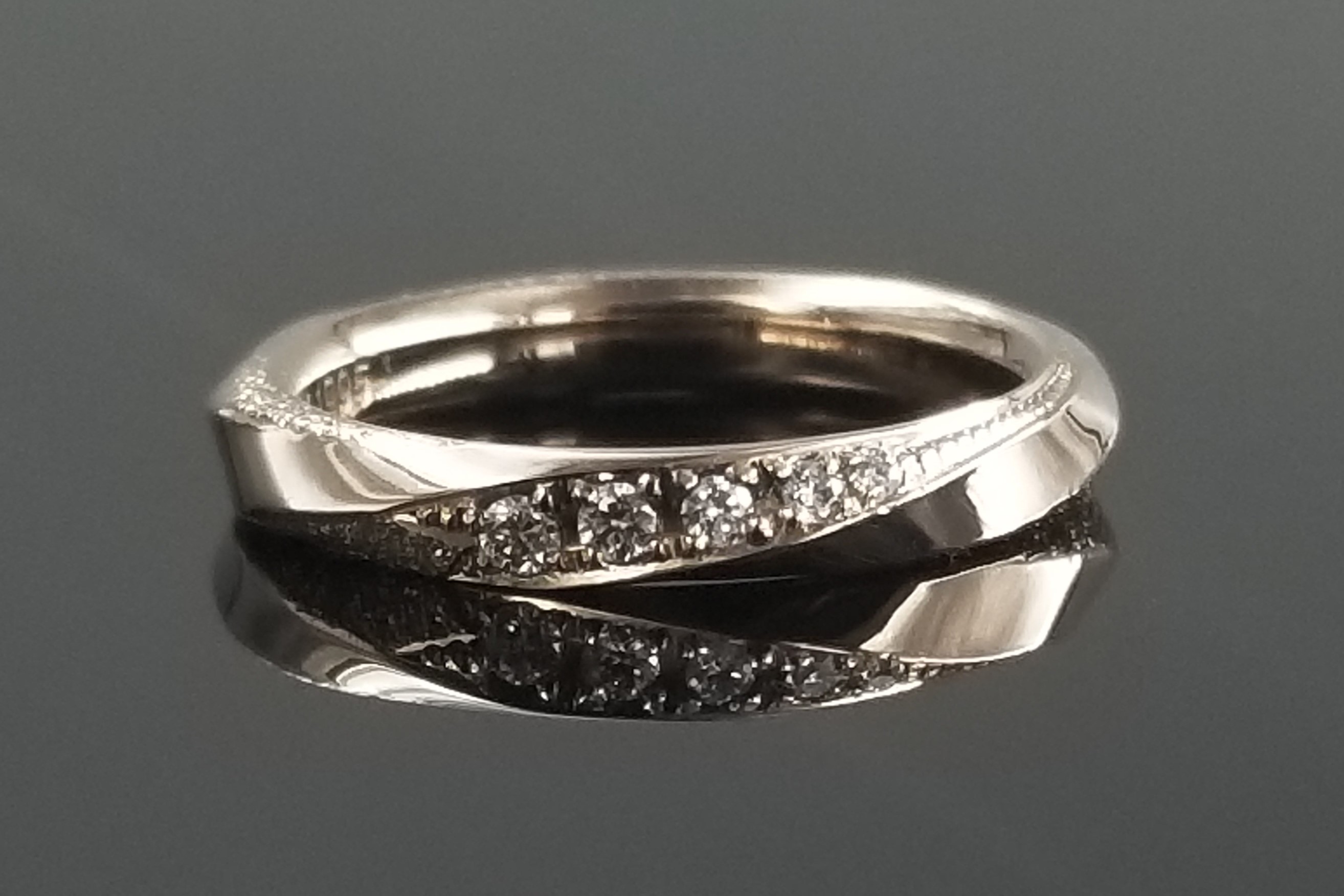 奥様は、ダイヤモンド5ピースを正面に施すことになりました。エッジに沿って飾りミルを側面まで伸ばすことで、よりひねり感が強調される大変素敵なデザインでございます!