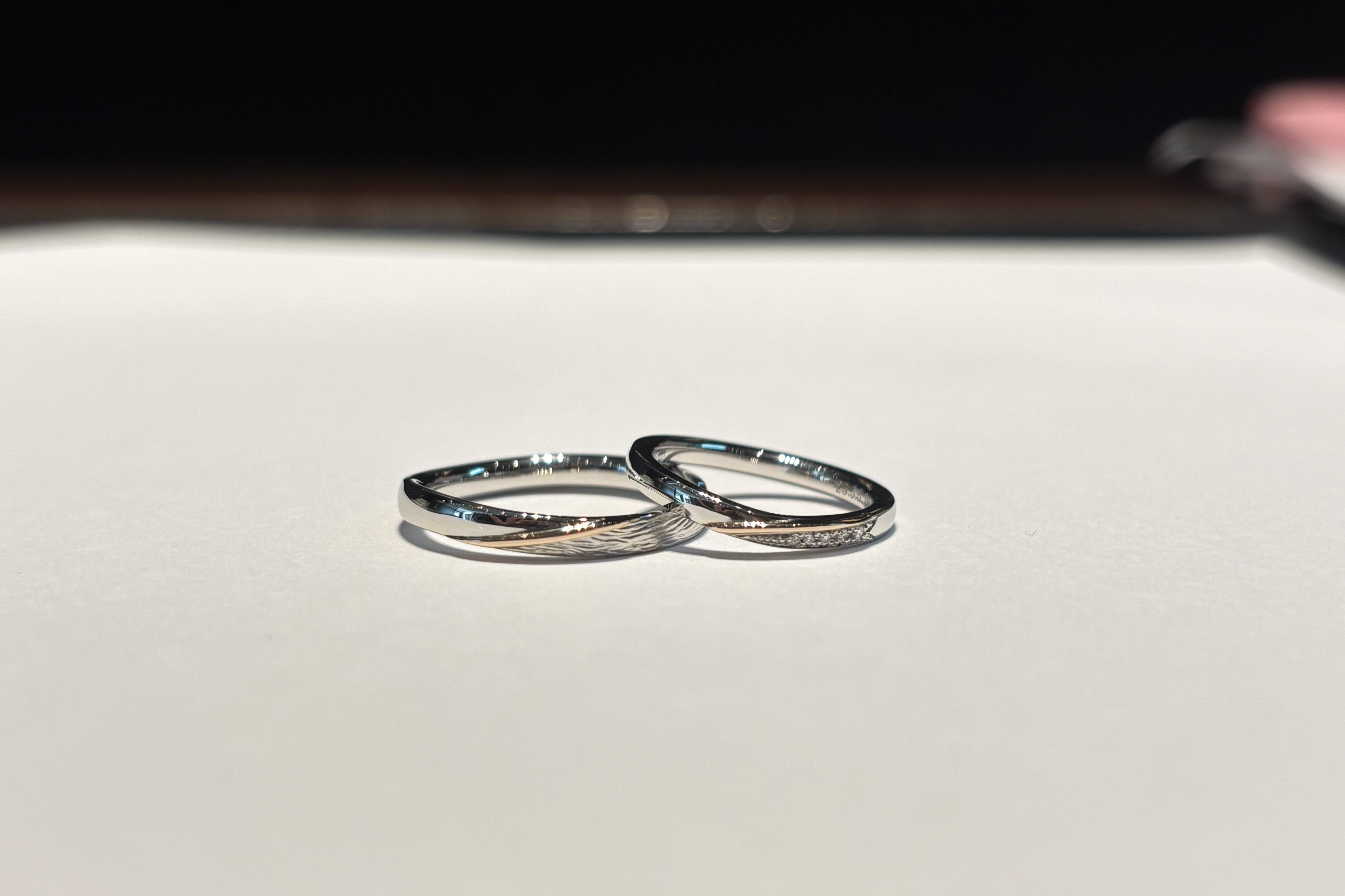旦那様のこだわりポイントは、個性が際立つ「木目模様加工」、奥様のこだわりポイントはダイヤモンドの留め終わりを「桜の花びら」のような形にしていただいた部分でございます!