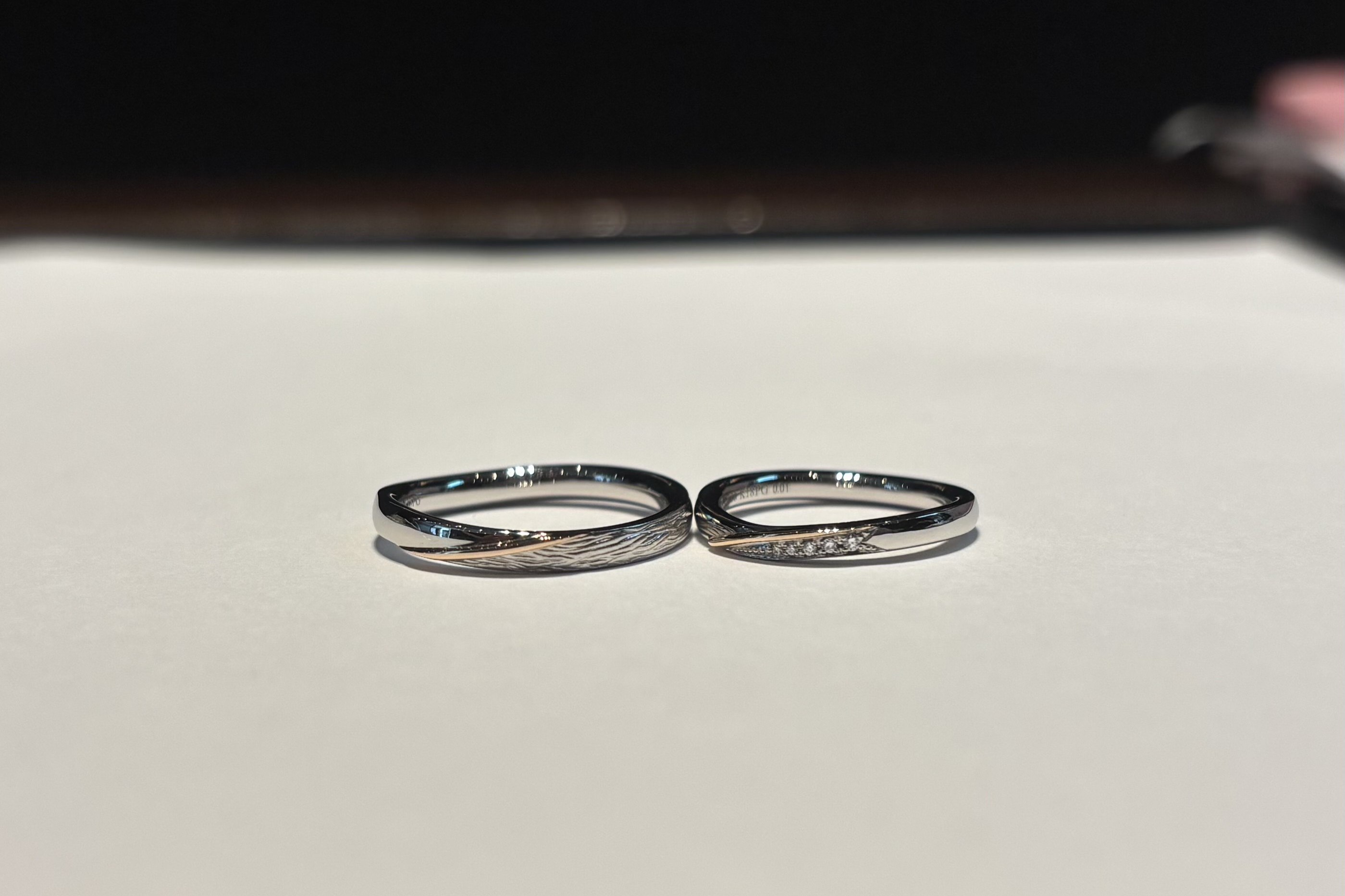 お二人とも、形状や太さはそれぞれのお好みでございますが、金線の長さや加工をお入れする場所を合わせることで、ペア感のある仕上がりとなっております!