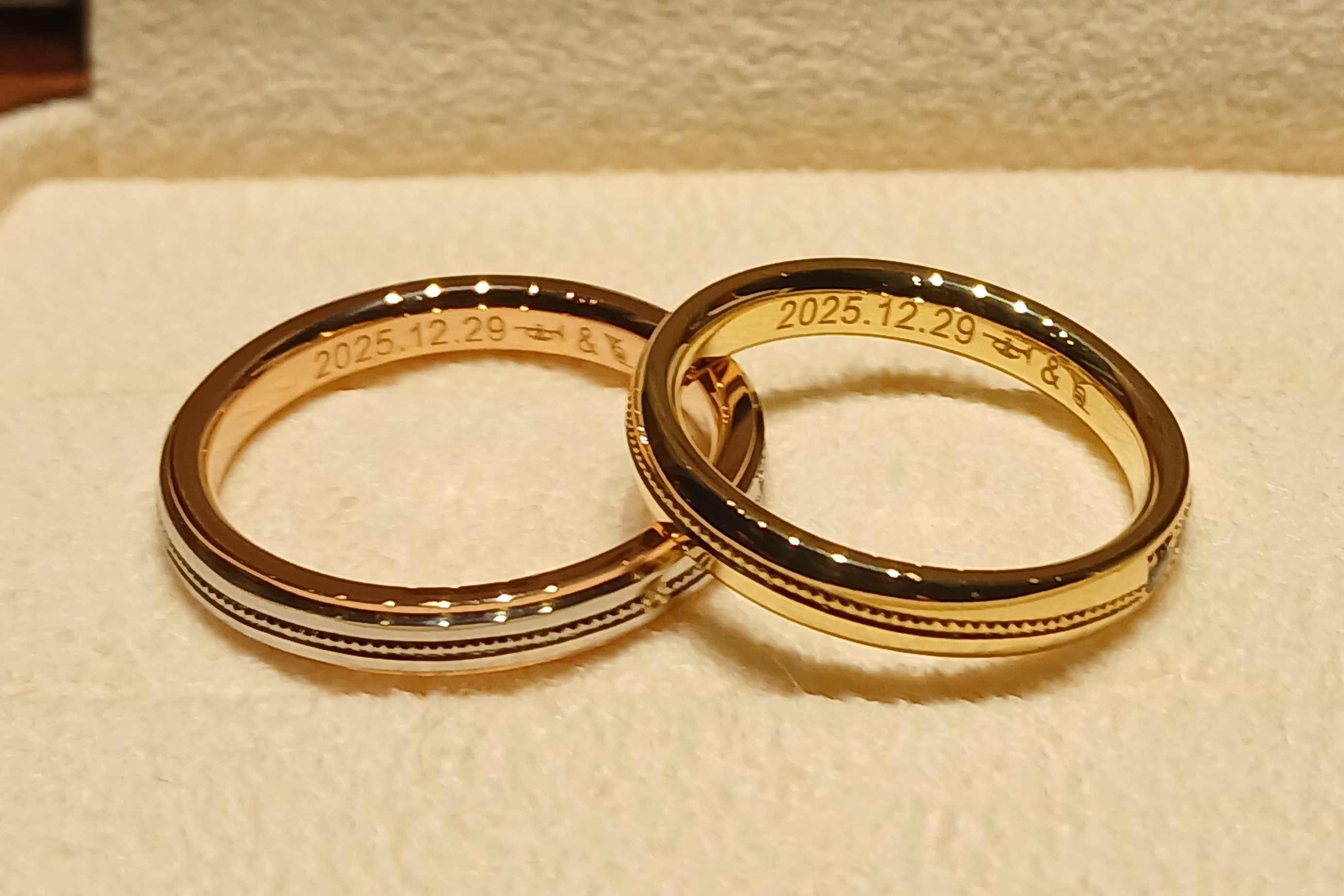 お二人にはお好みの形状を選んで頂きましたが、センターミルを施し、ダイヤモンドを3ピースずつお留めすることでお揃い感ばっちりの仕上がりになりました!