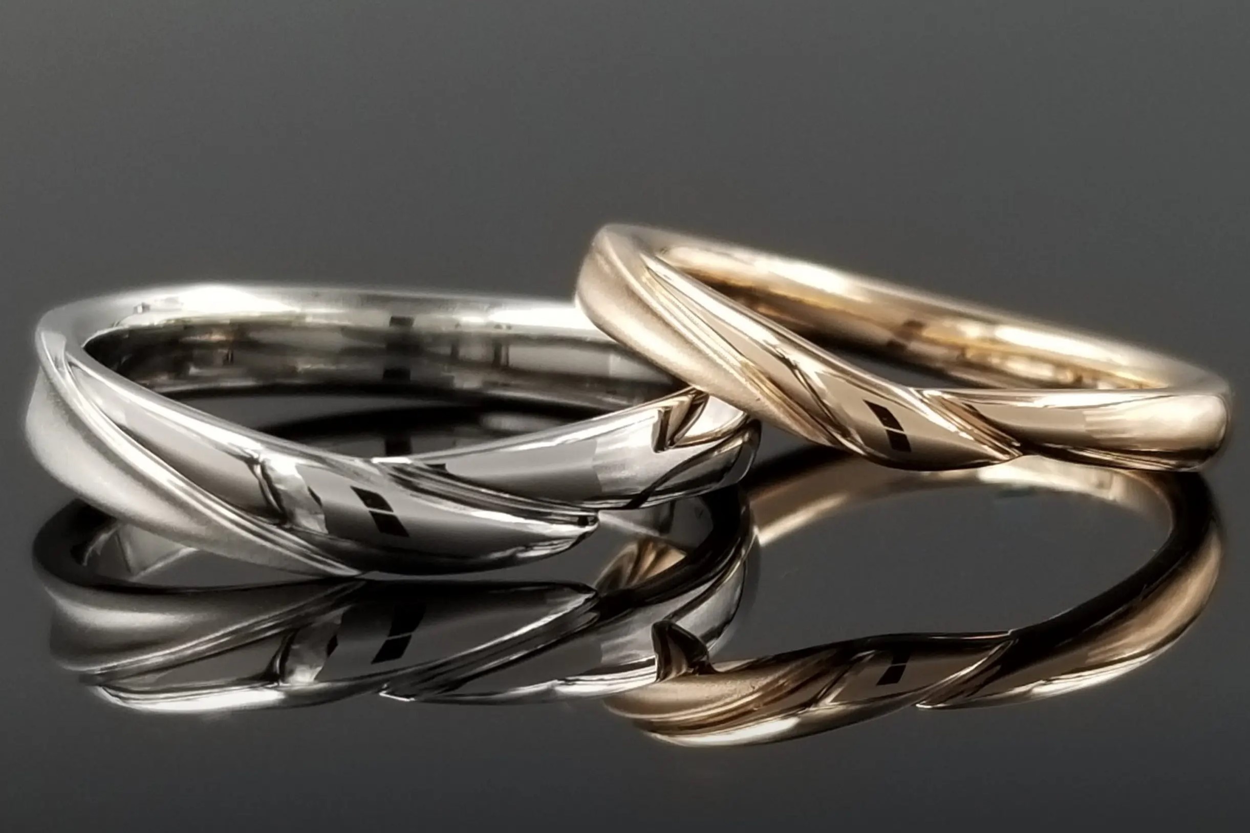 最初は鏡合わせのように削りの方向を逆にする案も出ておりましたが、せっかくのご結婚指輪ということで、お揃いの方向で削っていくことに。