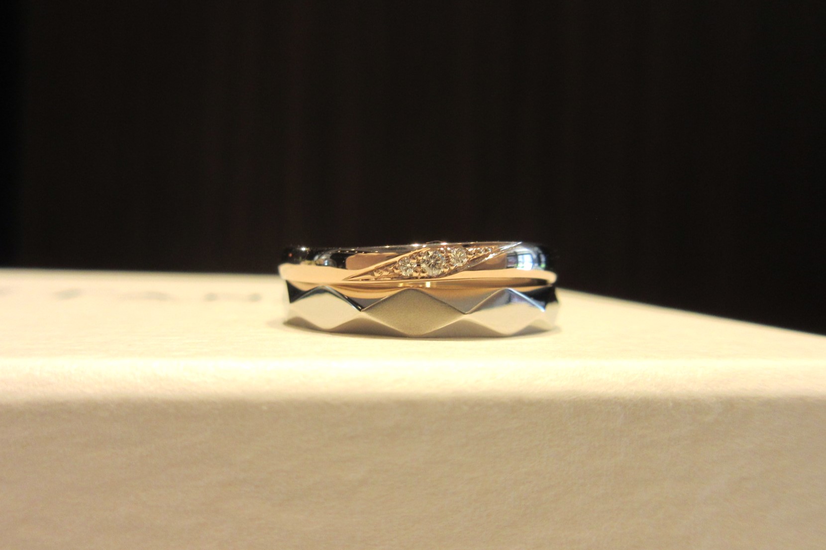 ご結婚指輪2本だけで見た時のペア感も大切にしていきたい!という想いから、奥様のダイヤモンド3石分と同じ範囲だけ、ご主人様のカッティング部分をマット加工することで、目立たせるようにいたしました。