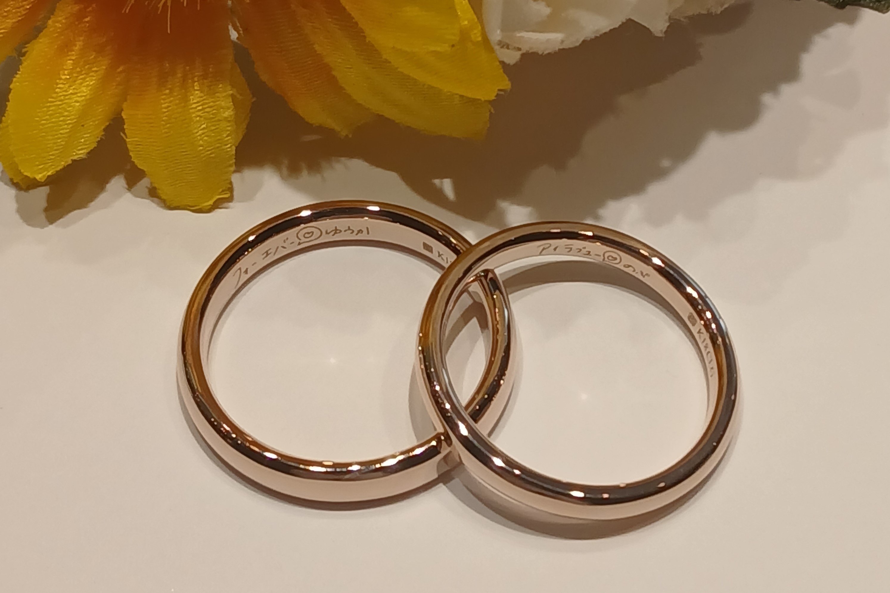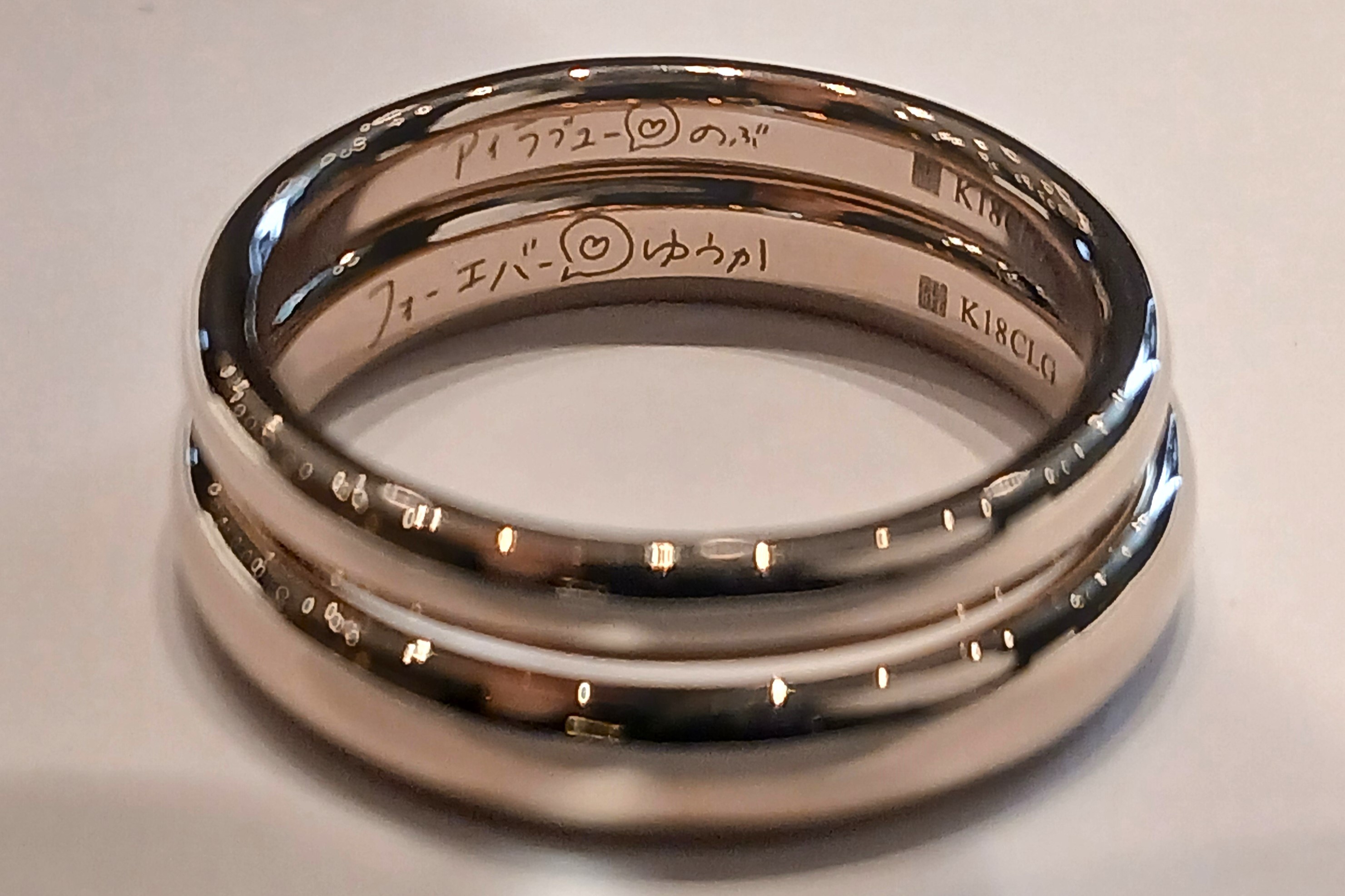 そうして完成した指輪は、シンプルながら共地金でのお造りという唯一無二のデザインに、奥様に描いて頂いた文字が映える本当に素敵なリングとなりました!