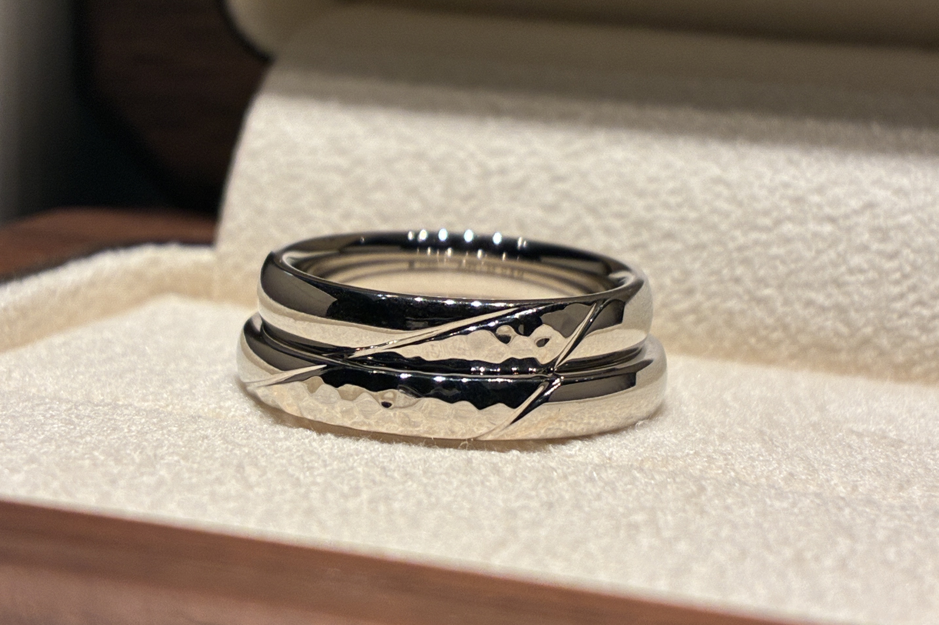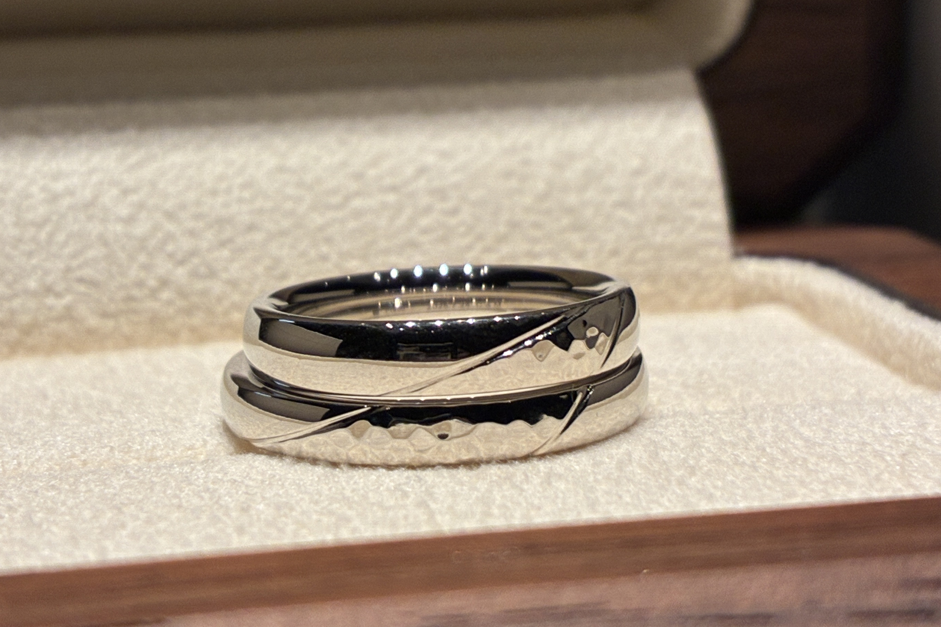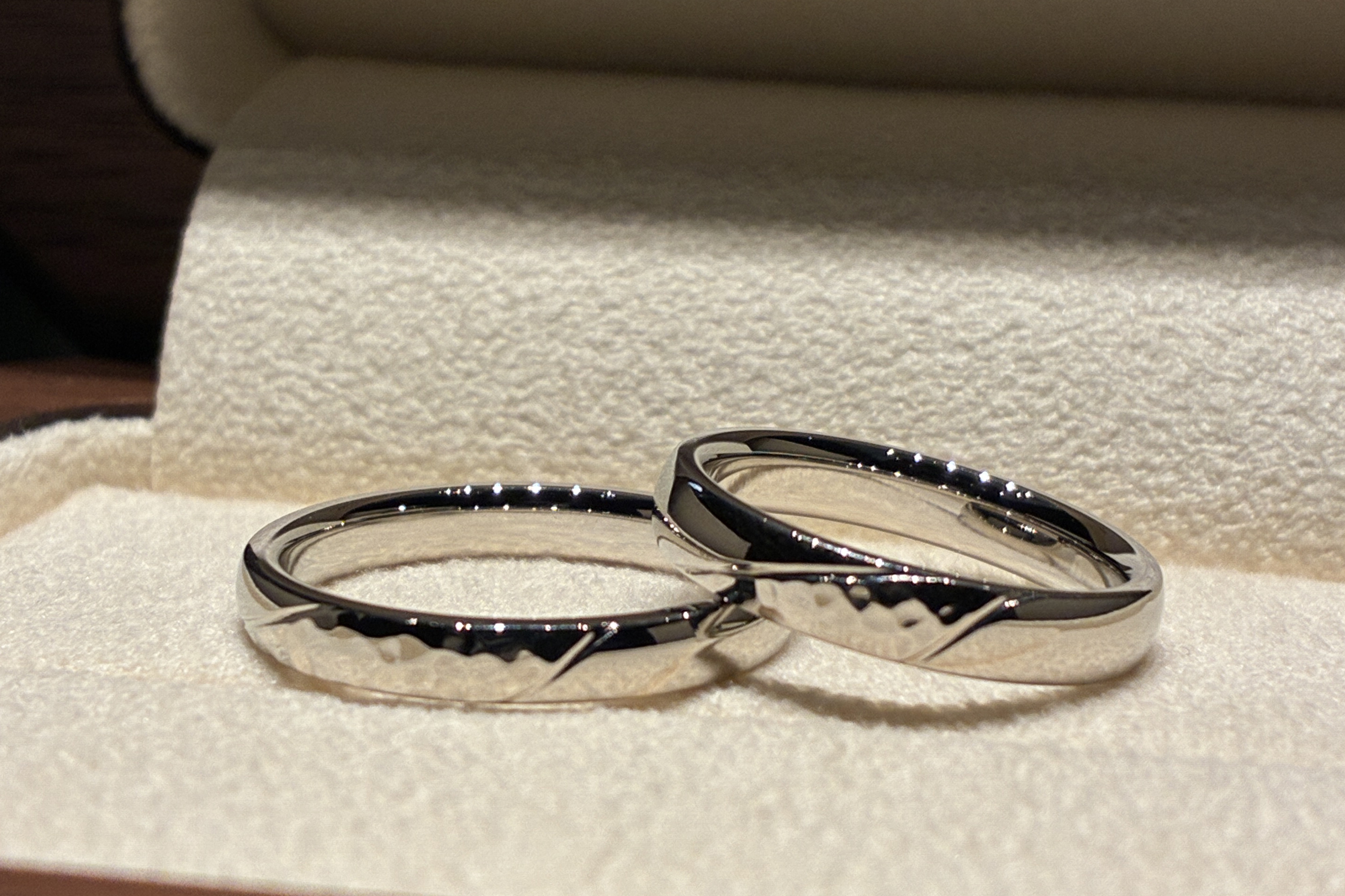 今回のお二人は、流れのある光や川のイメージをモチーフに、お二人の指輪を重ねたときにつながるようなラインをデザインし、鍛造らしい槌目の加工を組み合わせました。