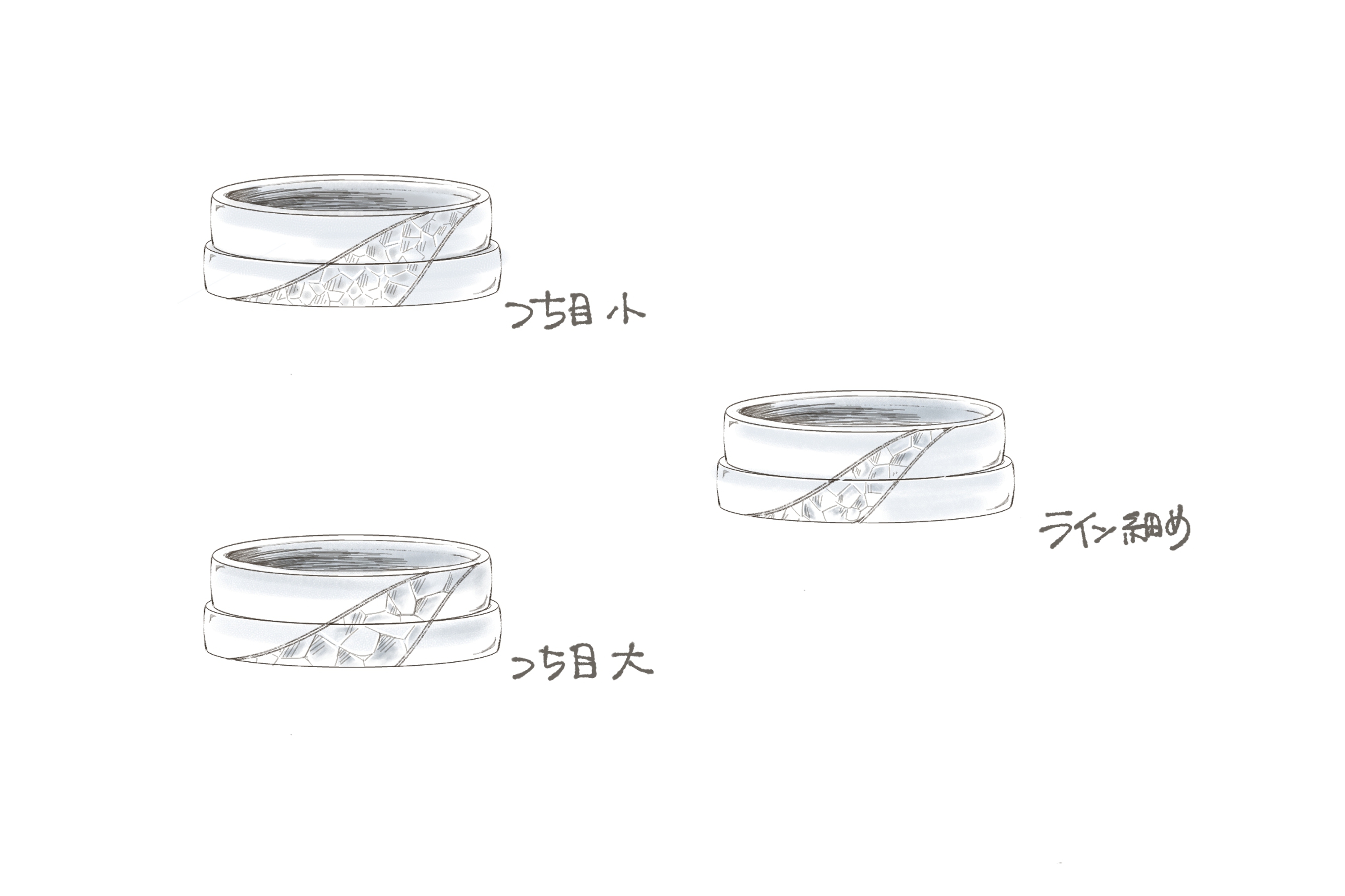 この【つながるデザイン】は、ラインや槌目だけでなく、面取りやマット・スターダスト・金線・金面など、様々な加工でお造りが可能です。