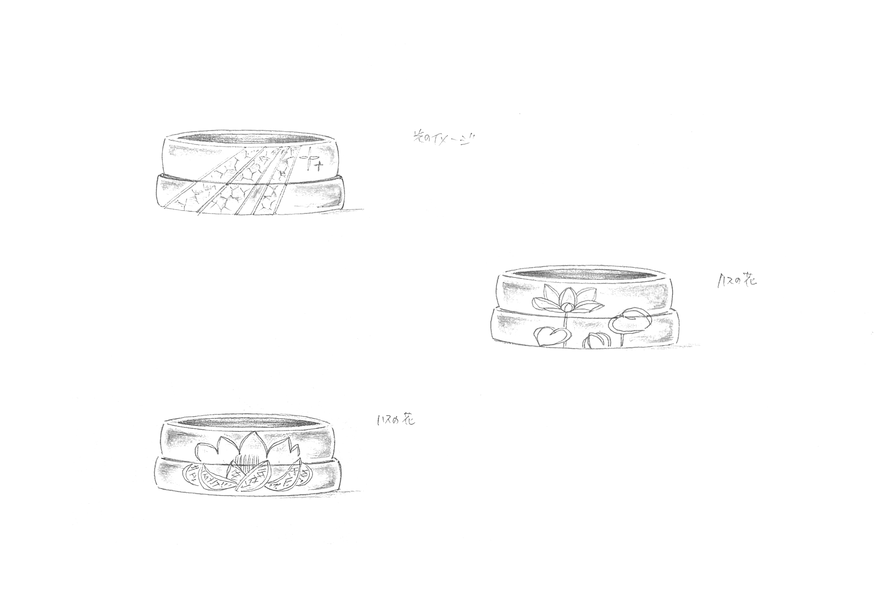 はじめ、具象的なお花のデザインをお二人でつながるように配置する案も出たのですが、やはり永く使っていく指輪でございますので、シンプルな印象にまとめていくことに!