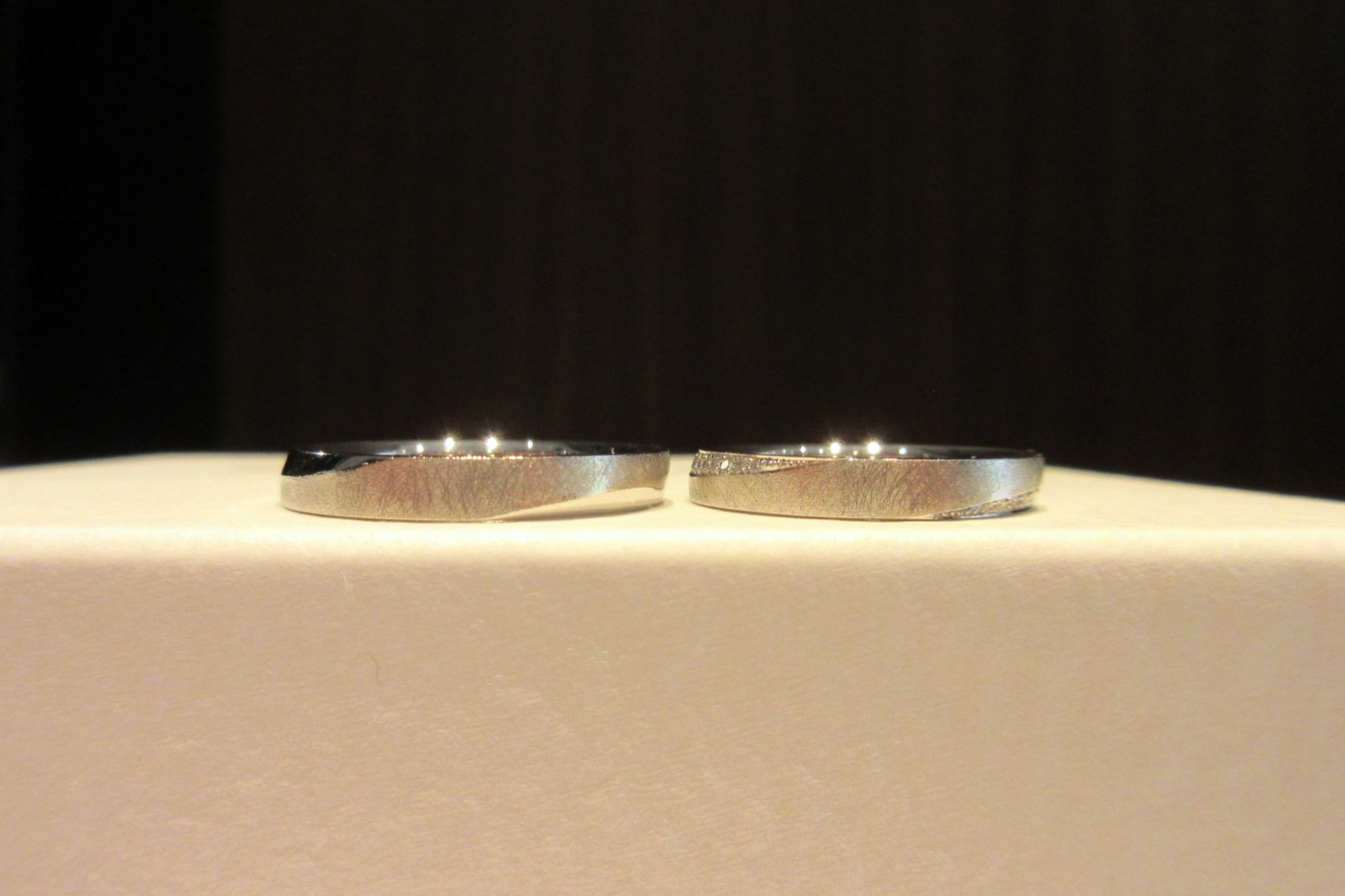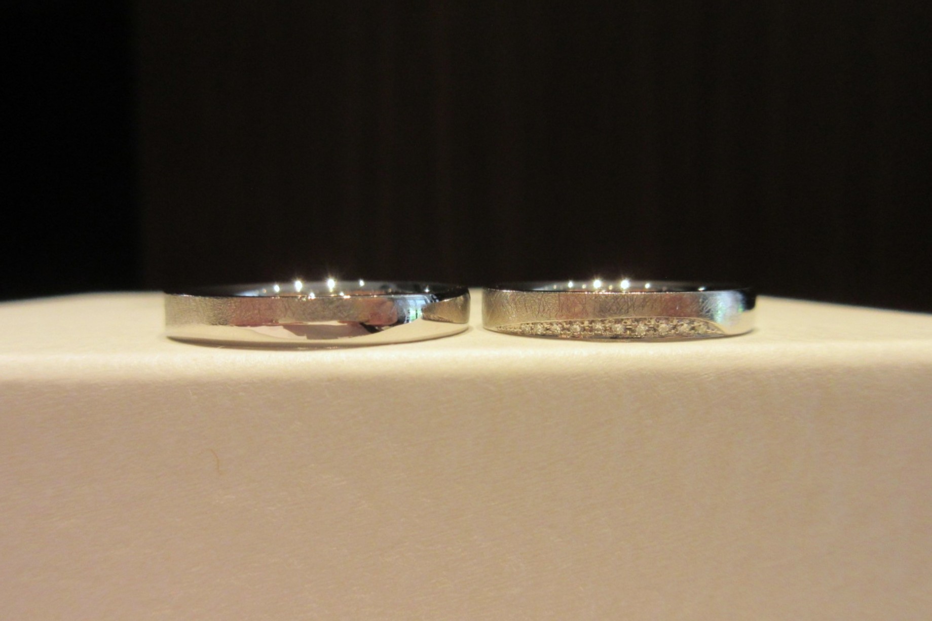 奥様は両サイドにダイヤモンドをお留めし、華やかさのあるデザインにいたしました。