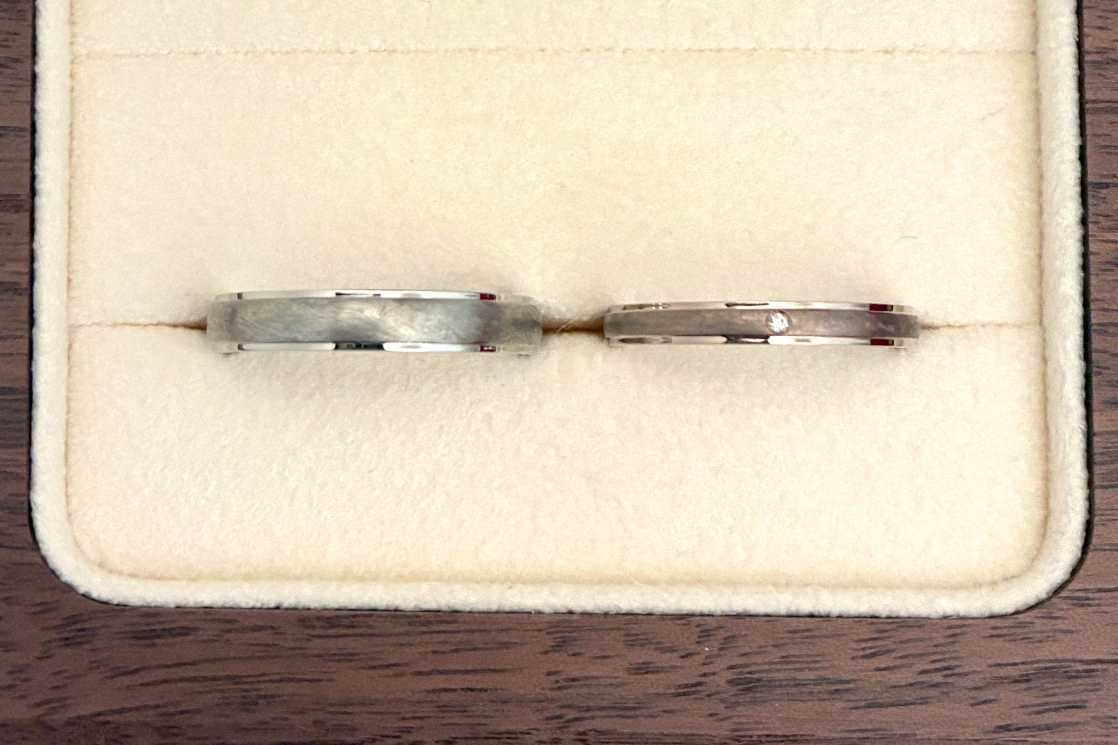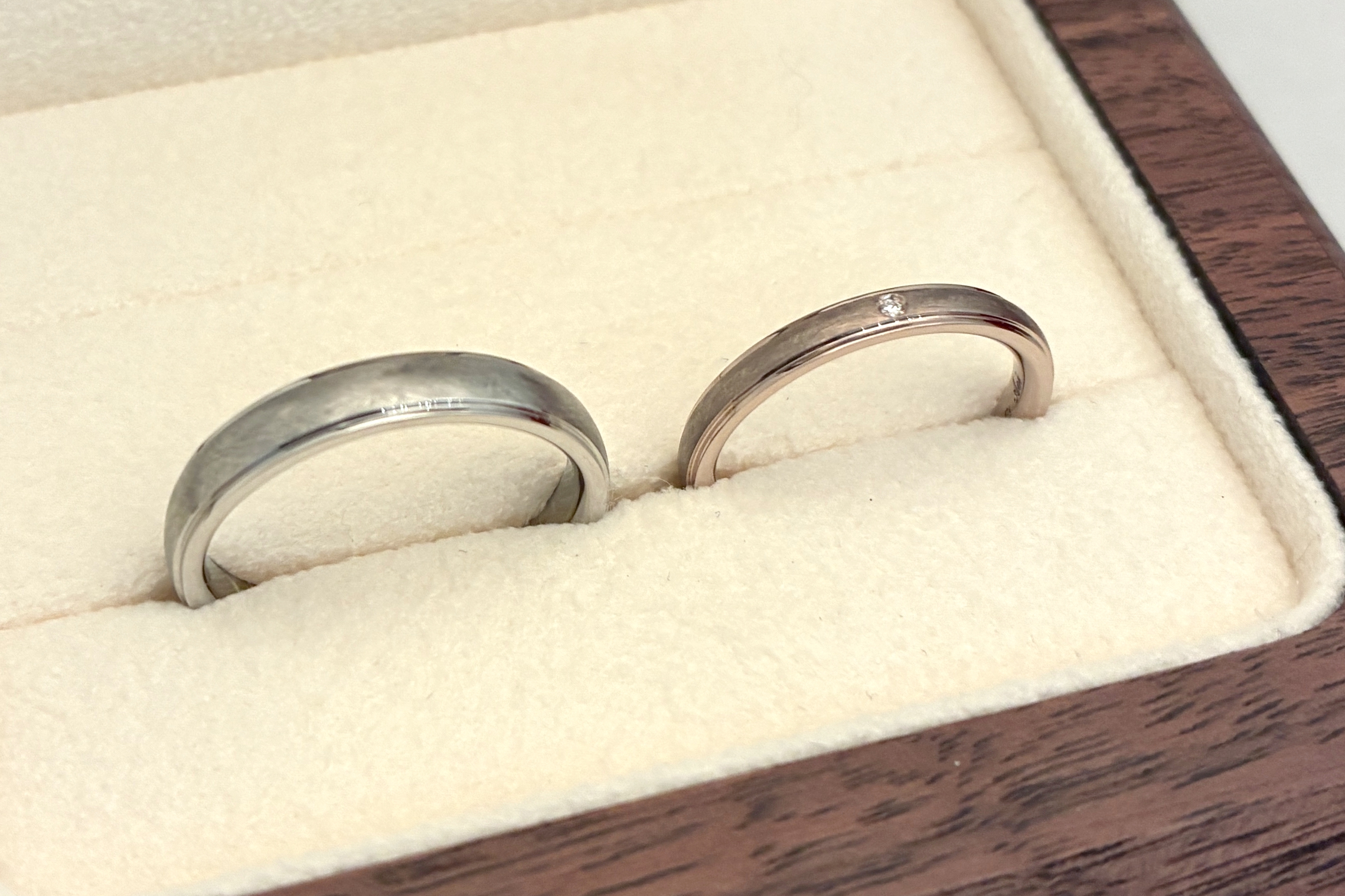 お素材は、お二人それぞれの肌馴染みの良いものをお選びいただきました。奥様にはワンポイントのダイヤモンドも組み合わせて、お揃いながらもお二人それぞれらしい指輪の完成です!
