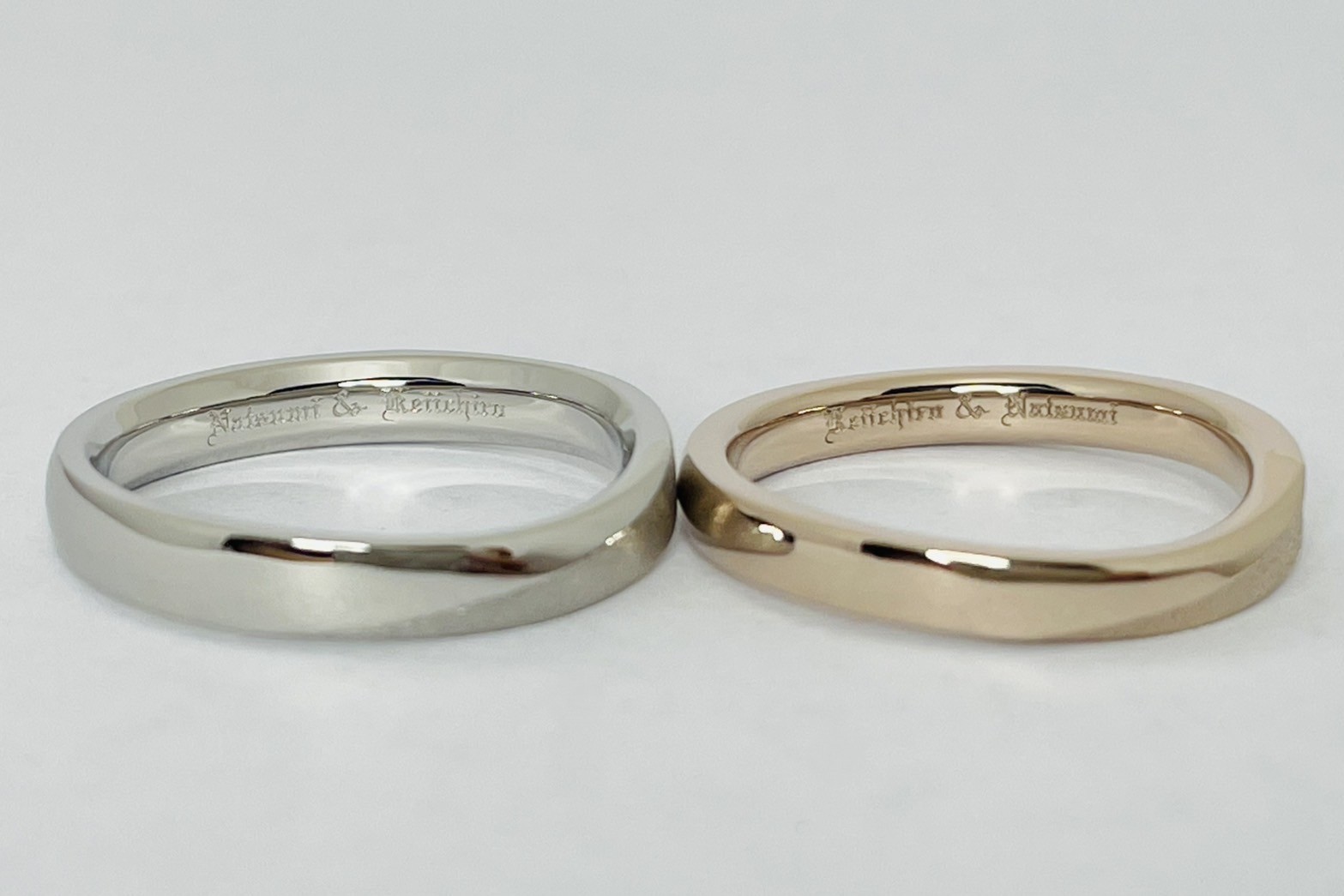 ウェーブ形状と面取りの加工をお揃いにすることで、それぞれ気に入った加工をお入れしてもしっかりとペア感のある指輪に仕上がりました!
