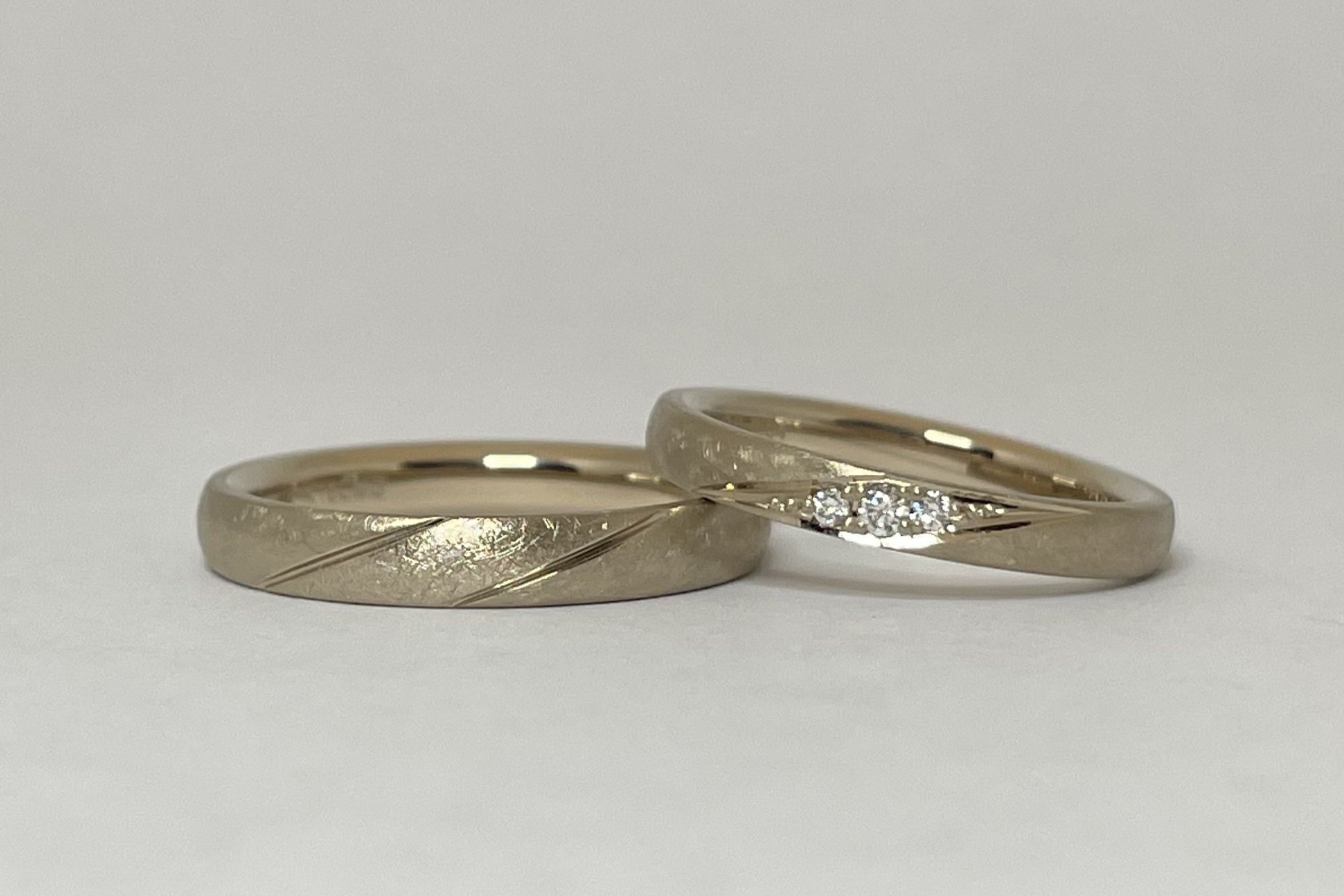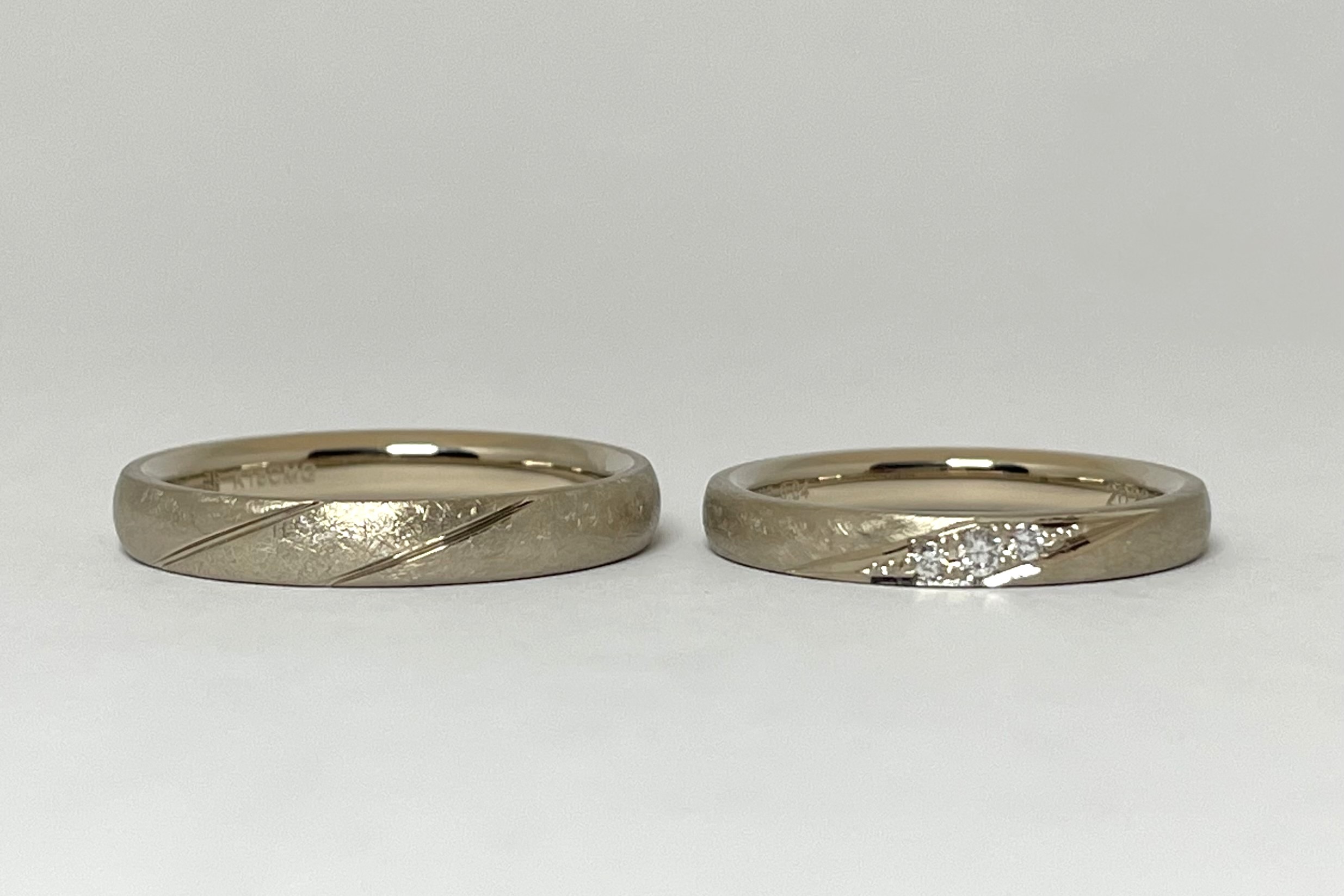 お揃いのシャンパンゴールドに、ラインを2本引き、ラインの外側をお揃いのアイスマット、そして男性はラインの内側にスクラッチ加工、女性はダイヤを3pcお留めしました。