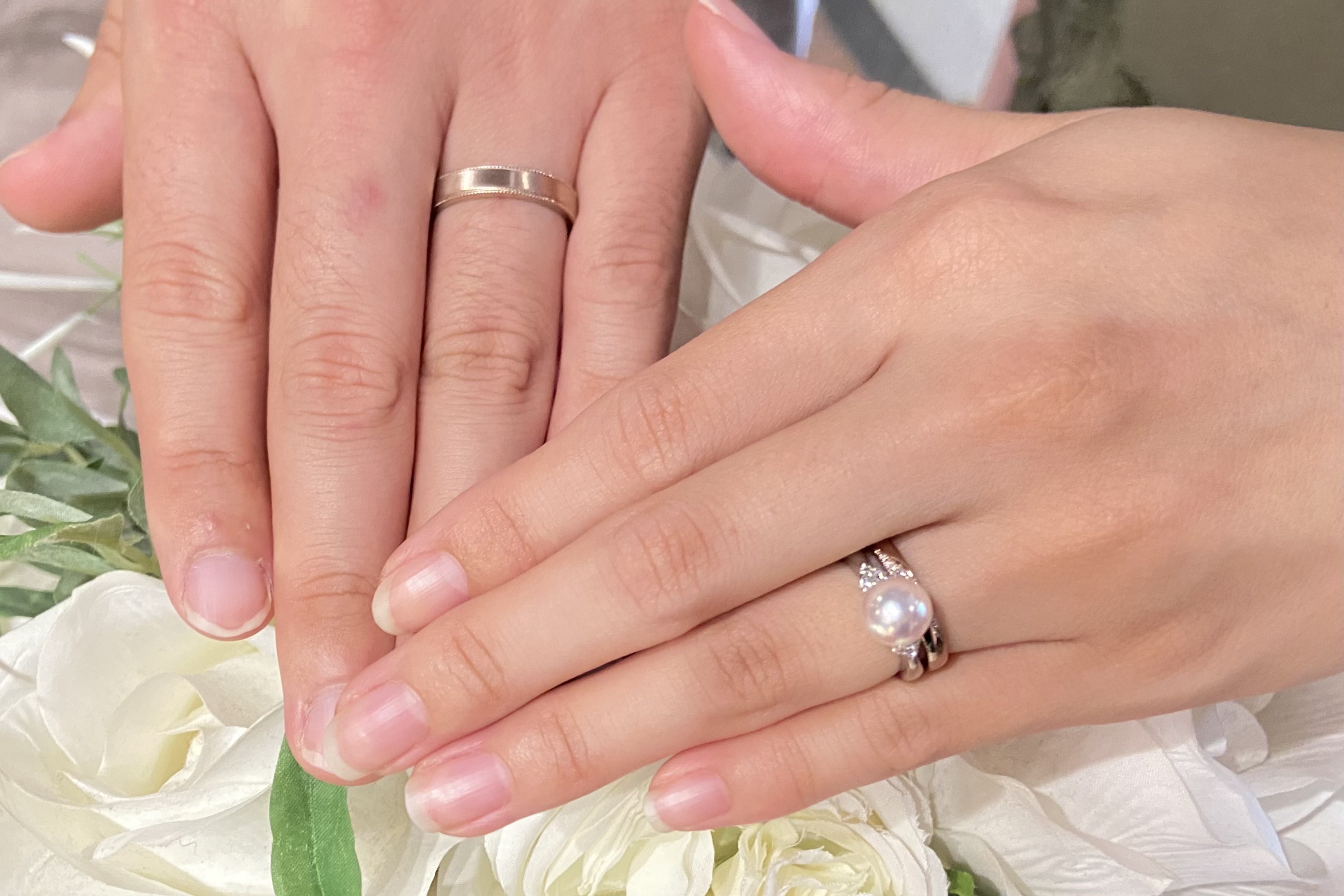 また、ご結婚指輪はコーラルゴールドにダイヤモンドがグラデーションに留まったデザインでございます。上品なパールの柔らかなピンク色と、鍛造製法の輝く鏡面のコーラルゴールドの相性がとても可愛いセットリングとなりました!