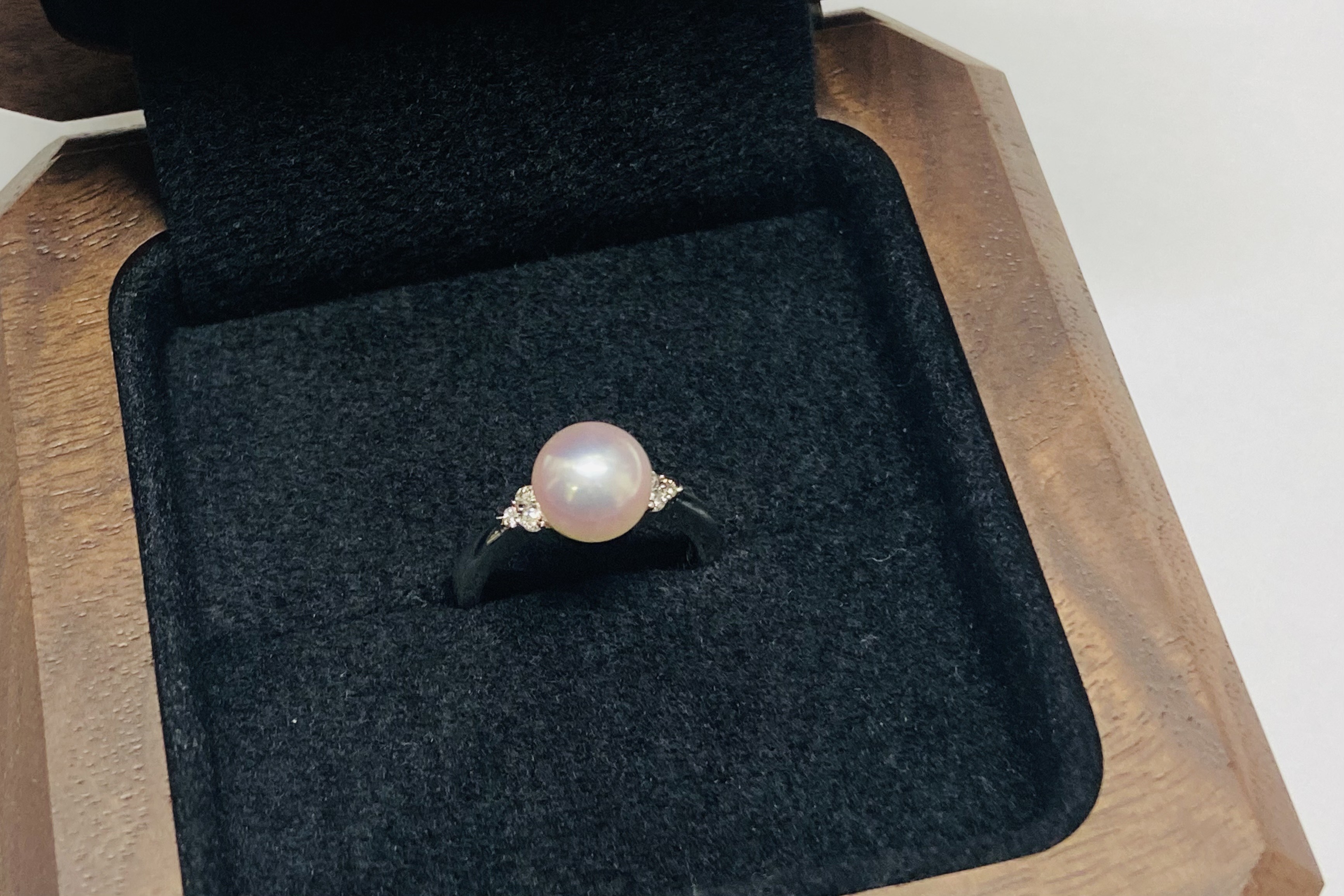 ご婚約指輪の定番といえばダイヤモンドですが、今回のお客様のご希望はパールでございました。