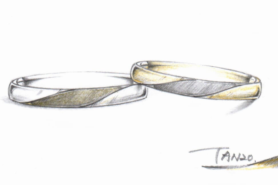 ご主人様はプラチナベースにシャンパンゴールドの面を貼り、奥様はシャンパンゴールドベースにプラチナの面を貼ることで、補いあうようなイメージの素敵なデザインでございます!