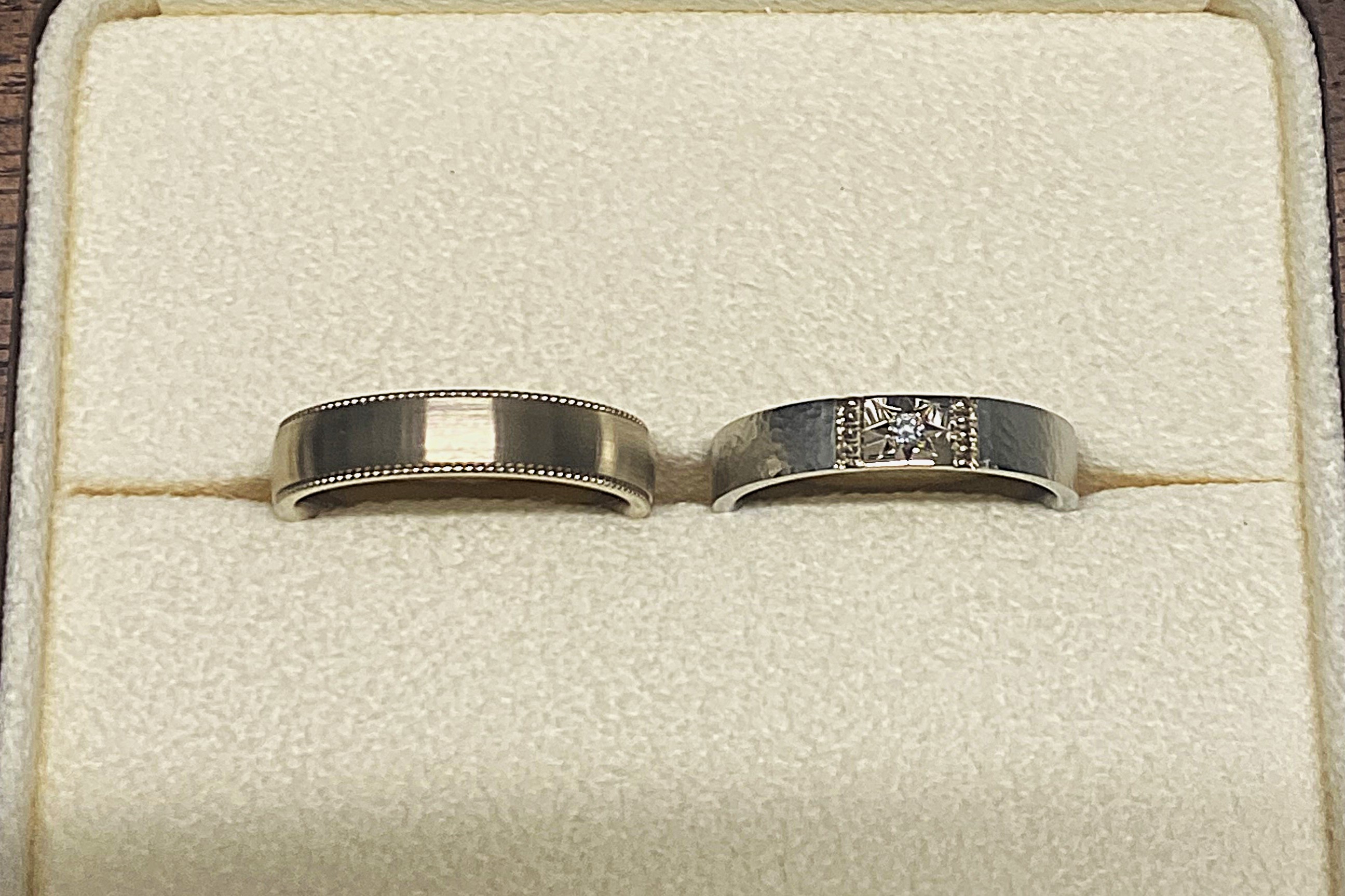 どこかでお揃い感は欲しいよねというお話でございましたので、奥様に貼る金の素材をご主人様と同じシャンパンゴールドにすることでぐっとお揃い感を出していきます。もちろん奥様にはダイヤモンドを後光留めして華やかさも忘れず出してきます!