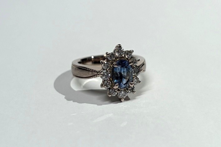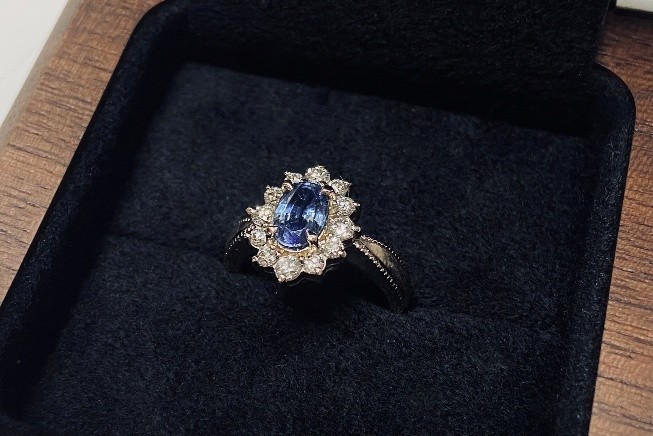 そんなお二人はお持ち込み頂きました青いオーバルのお石を使って他にはないオーダーメイドでご婚約指輪を造りたい!とご希望頂きました。