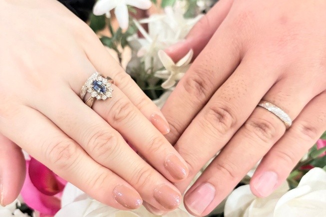 ご婚約指輪と同じ加工を入れつつも変化をつけるおしゃれさが、お二人にぴったりでございました。