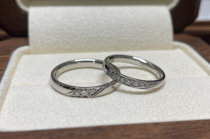 お二人とお話を進めていき、奥様とご主人様でダイヤモンドの個数を変えて、お二人らしさを表現しました。穏やかで、息の合ったお二人にぴったりなとっても素敵なデザインになりました。
