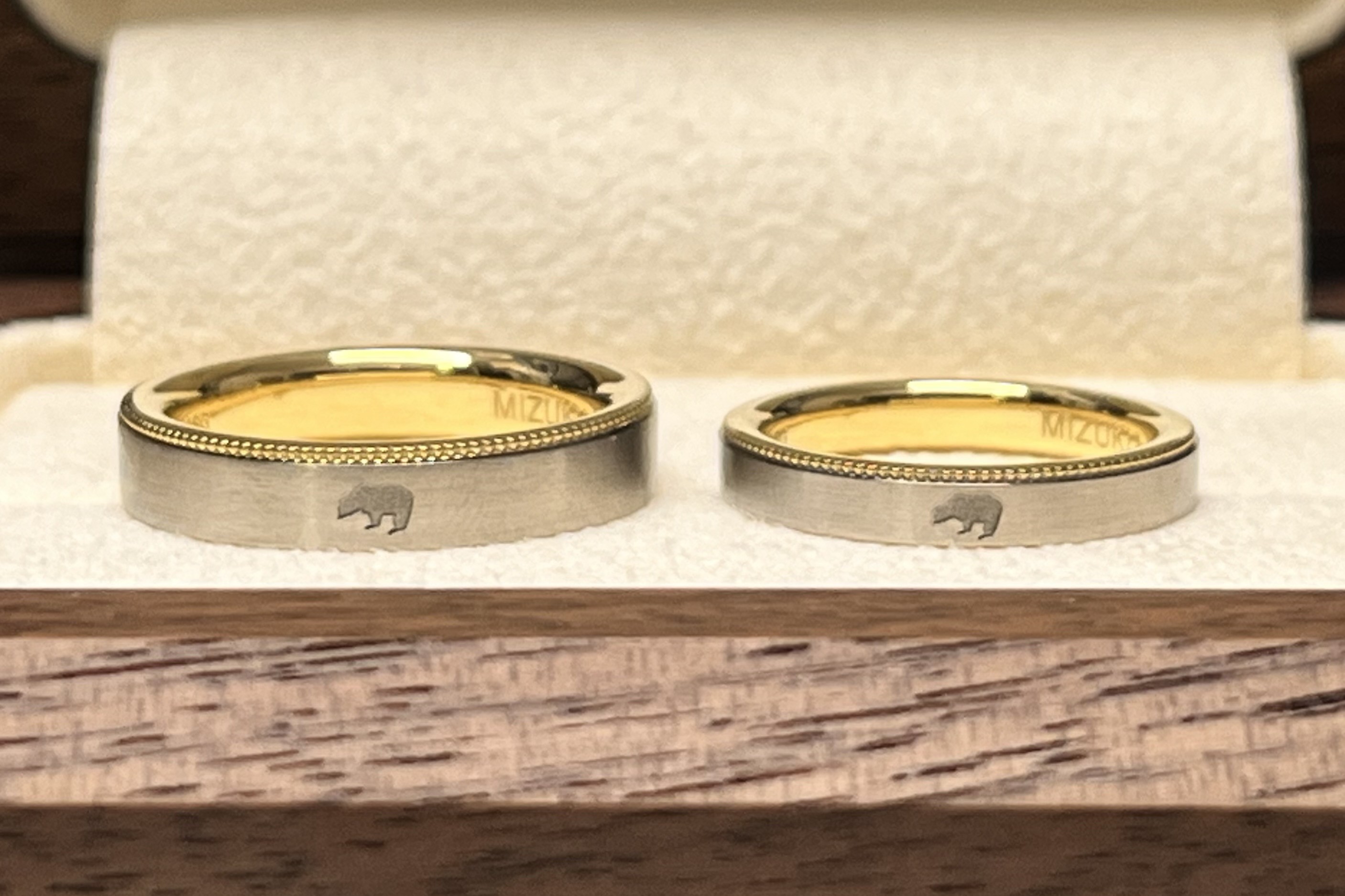 2色使いの「コンビデザイン」にお二人で選んだクマさんの刻印、その刻印を際立たせるつや消し「ヘアライン加工」をお入れした素敵な指輪でございます。