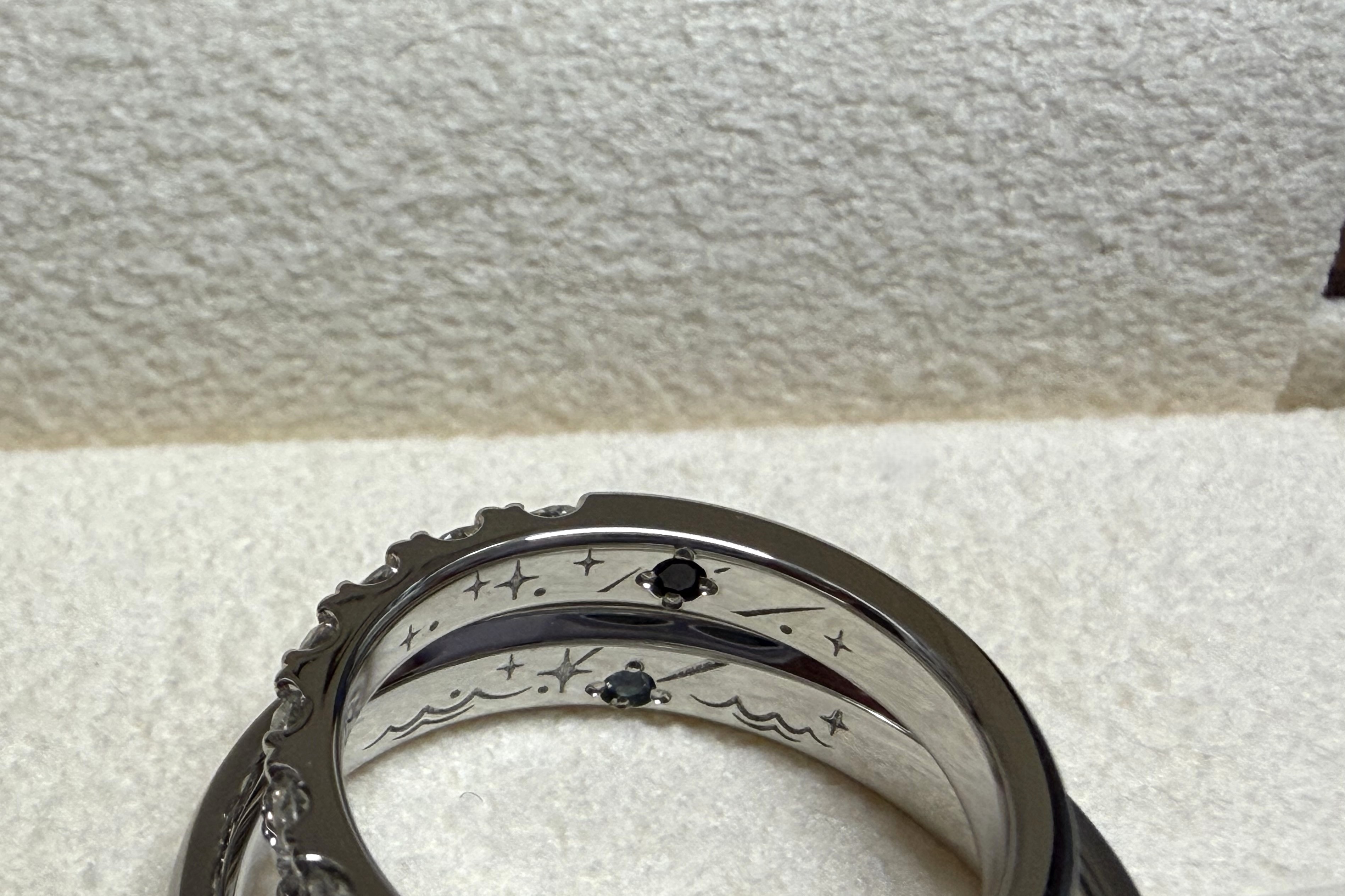 たくさんこだわっていただき決定した世界に一つだけの刻印は、満点の星空と波がお二人の指輪を重ねることで完成いたします。